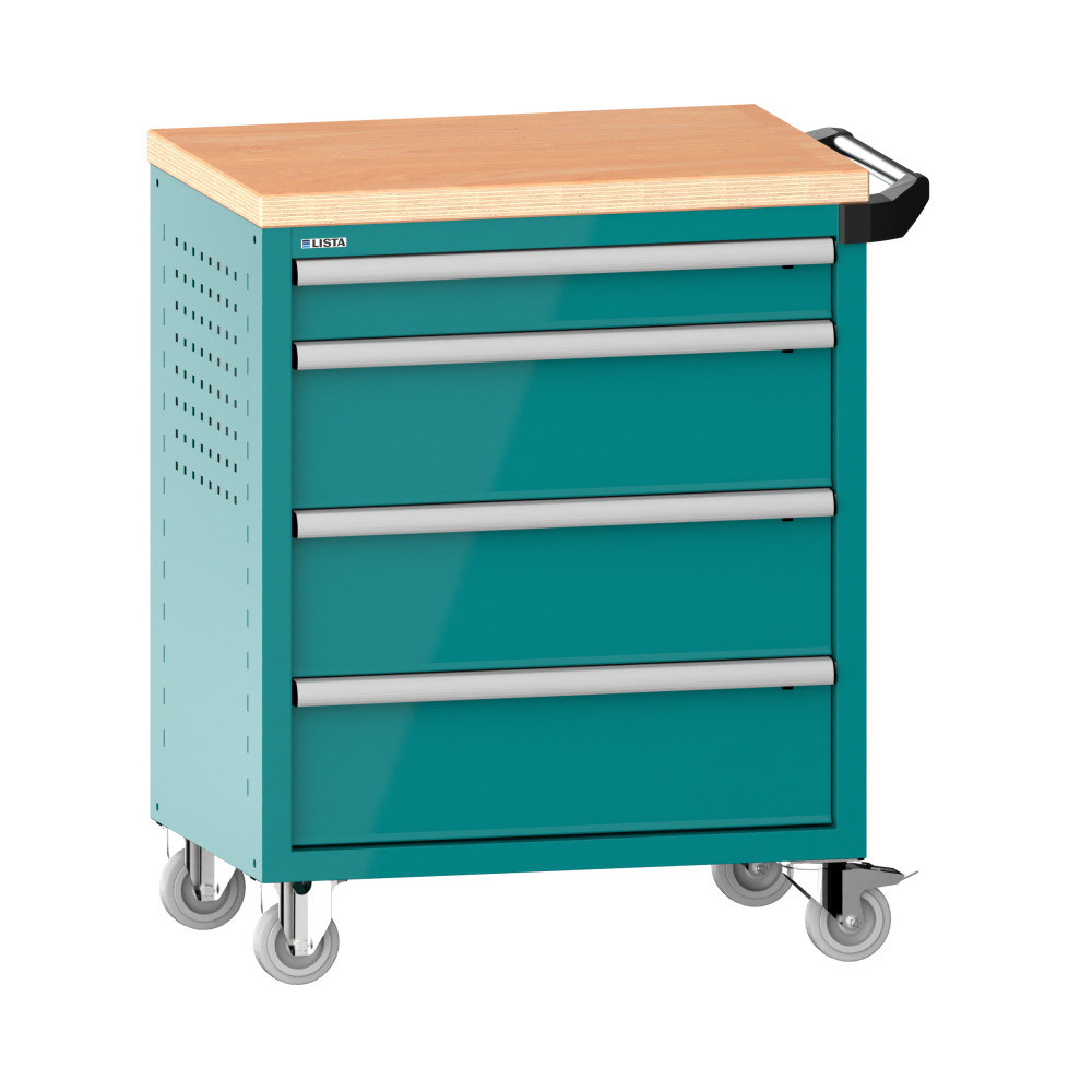 Carro de taller 36x27E (AxPxA) 833x525x945mm 4 cajones (1x100/3x200) 40kg con cubierta de madera de multiplex retén de seguridad sencillo a la derecha KEY Lock Azul turquesa RAL 5018
