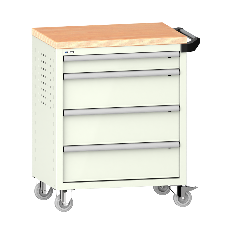 Carro de taller 36x27E (AxPxA) 833x525x945mm 4 cajones (1x100/3x200) 40kg con cubierta de madera de multiplex retén de seguridad sencillo a la derecha KEY Lock Blanco grisáceo RAL 9002