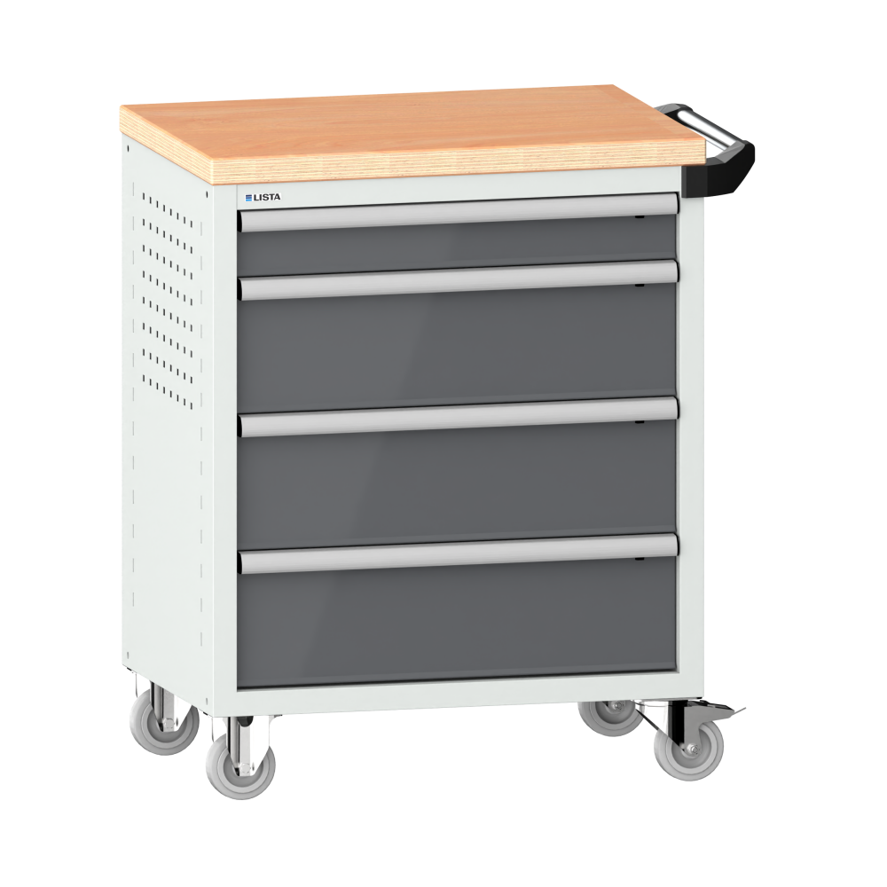 Carro de taller 36x27E (AxPxA) 833x525x945mm 4 cajones (1x100/3x200) 40kg con cubierta de madera de multiplex retén de seguridad sencillo a la derecha KEY Lock Gris luminoso RAL 7035 / Gris metalizado NCS S 6502-B