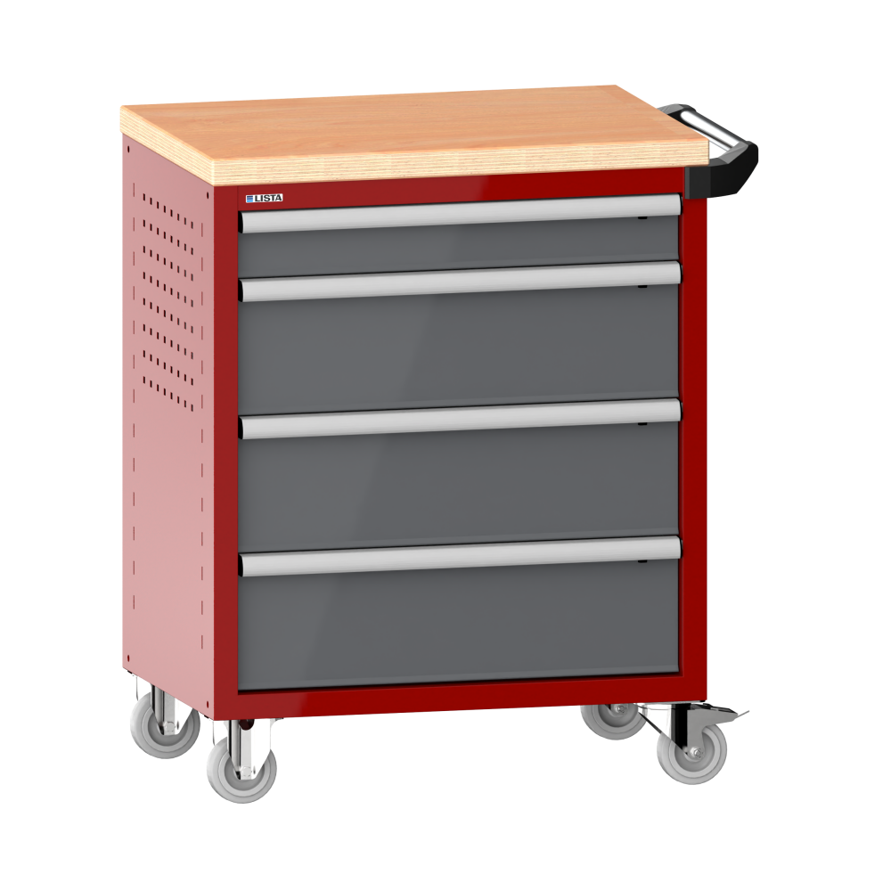 Carro de taller 36x27E (AxPxA) 833x525x945mm 4 cajones (1x100/3x200) 40kg con cubierta de madera de multiplex retén de seguridad sencillo a la derecha KEY Lock Rojo rubí RAL 3003 / Gris metalizado NCS S 6502-B
