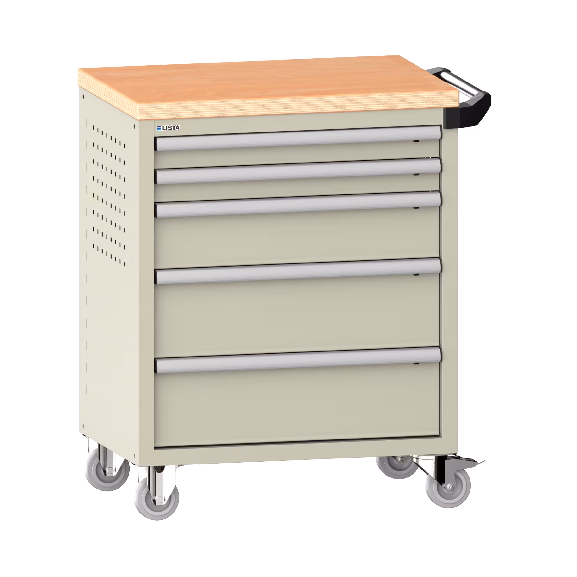 Carro de taller 36x27E (AxPxA) 833x525x945mm 5 cajones (2x75/1x150/2x200) 40kg con cubierta de madera de multiplex retén de seguridad sencillo a la derecha KEY Lock Gris guijarro RAL 7032