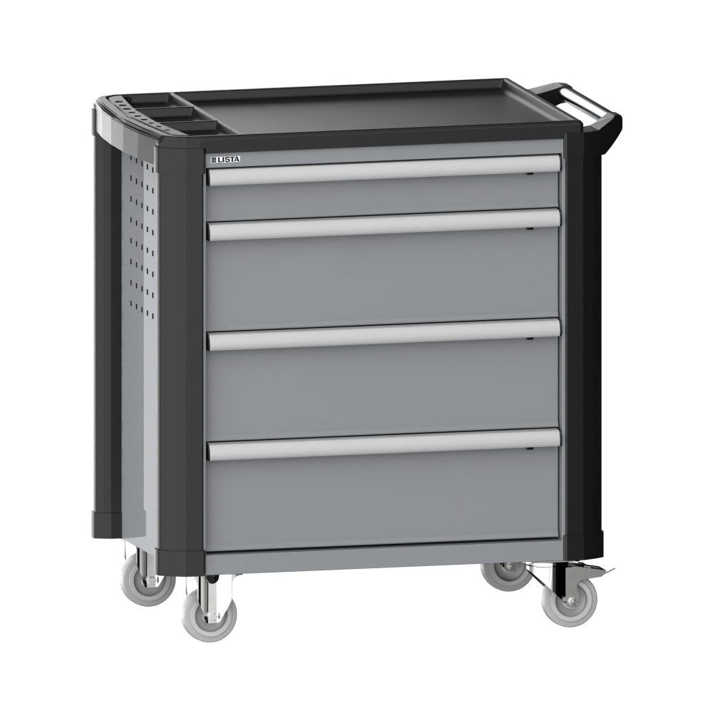 Carro de taller 36x27E (AxPxA) 894x525x928mm 4 cajones (1x100/3x200) 40kg con cubierta de plástico y protección de esquinas retén de seguridad sencillo a la derecha KEY Lock Gris cenzia NCS S 4502-B