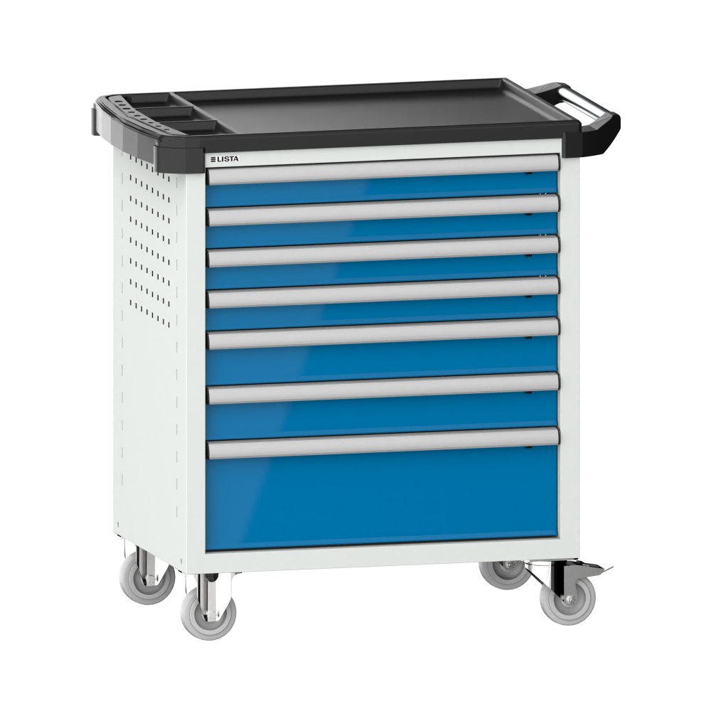 Carro de taller 36x27E (AxPxA) 894x525x928mm 7 cajones (4x75/2x100/1x200) 40kg con cubierta de plástico retén de seguridad sencillo a la derecha KEY Lock Gris luminoso RAL 7035 / Azul luminoso RAL 5012