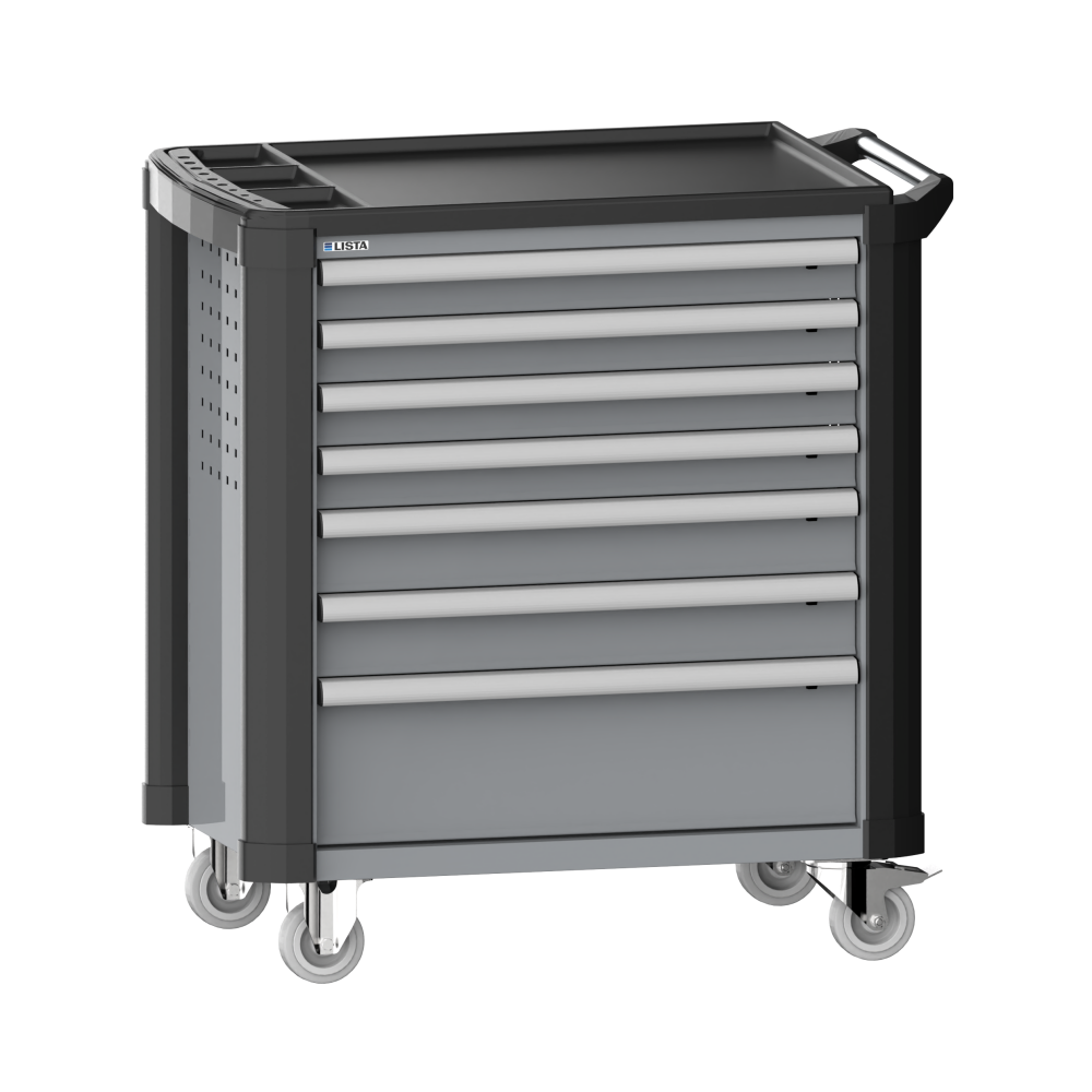 Carro de taller 36x27E (AxPxA) 894x525x928mm 7 cajones (4x75/2x100/1x200) 40kg con cubierta de plástico y protección de esquinas retén de seguridad sencillo a la derecha KEY Lock Gris cenzia NCS S 4502-B
