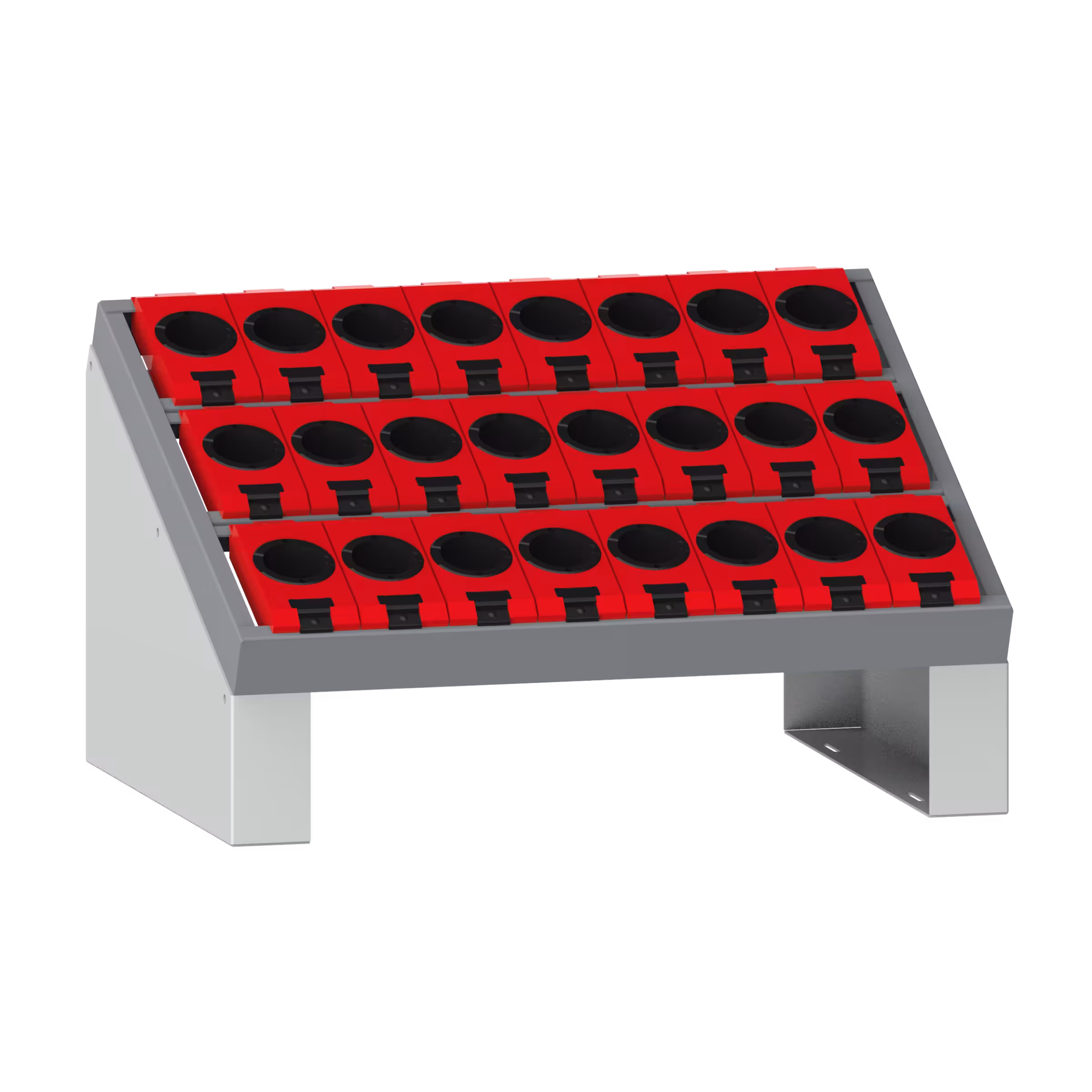 Soporte de mesa de herramientas: hay disponibles modelos preconfigurados o configuraciones individuales con bastidor de inserción enroscado o con opción de colgar bandejas portaconos sin atornillar. Se permite una colocación horizontal o inclinada de la bandeja portaconos. Modelo: chapa de acero