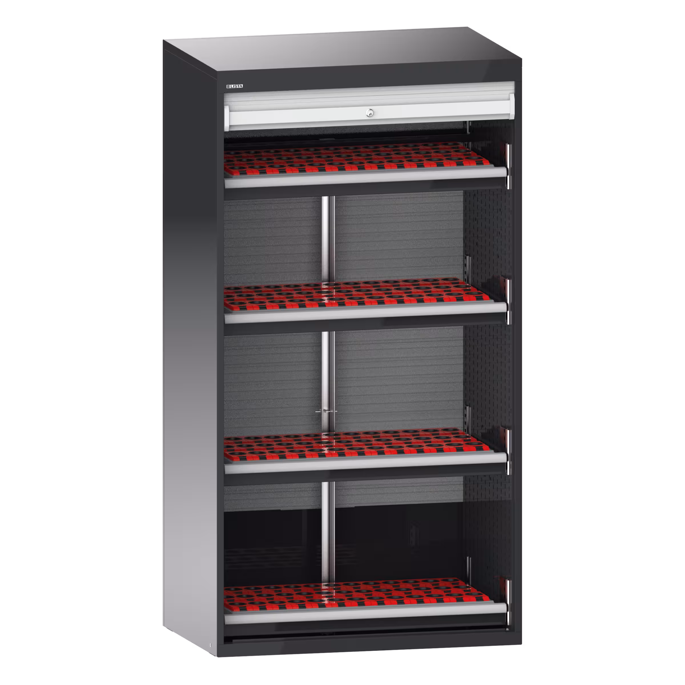 Bâti d’armoire : Le bâti d'armoire est doté d'une double paroi, de parois latérales à fentes pour accrocher les rayons extensibles et amovibles, tiroirs et cadres interchangeables pour outils. La zone de réglage est subdivisée par trame de 25 mm. Exécution : tôle d'acier.