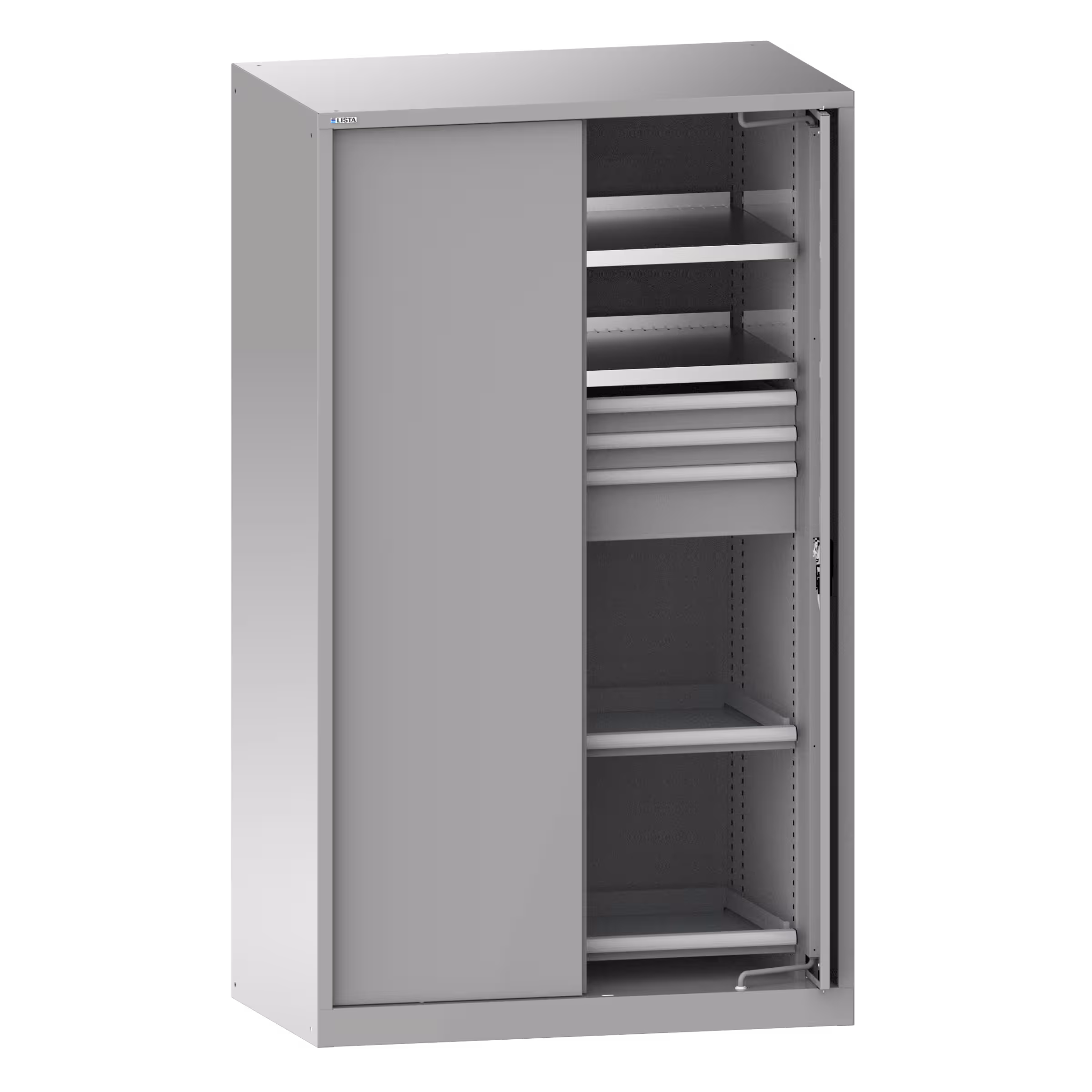 Armoire à charges lourdes avec 2 portes escamotables en tôle pleine 54x27E (LxPxH) 1146x690x1950mm 2 rayons, 3 tiroirs, 2 rayons extensibles KEY Lock Aluminium blanc RAL 9006