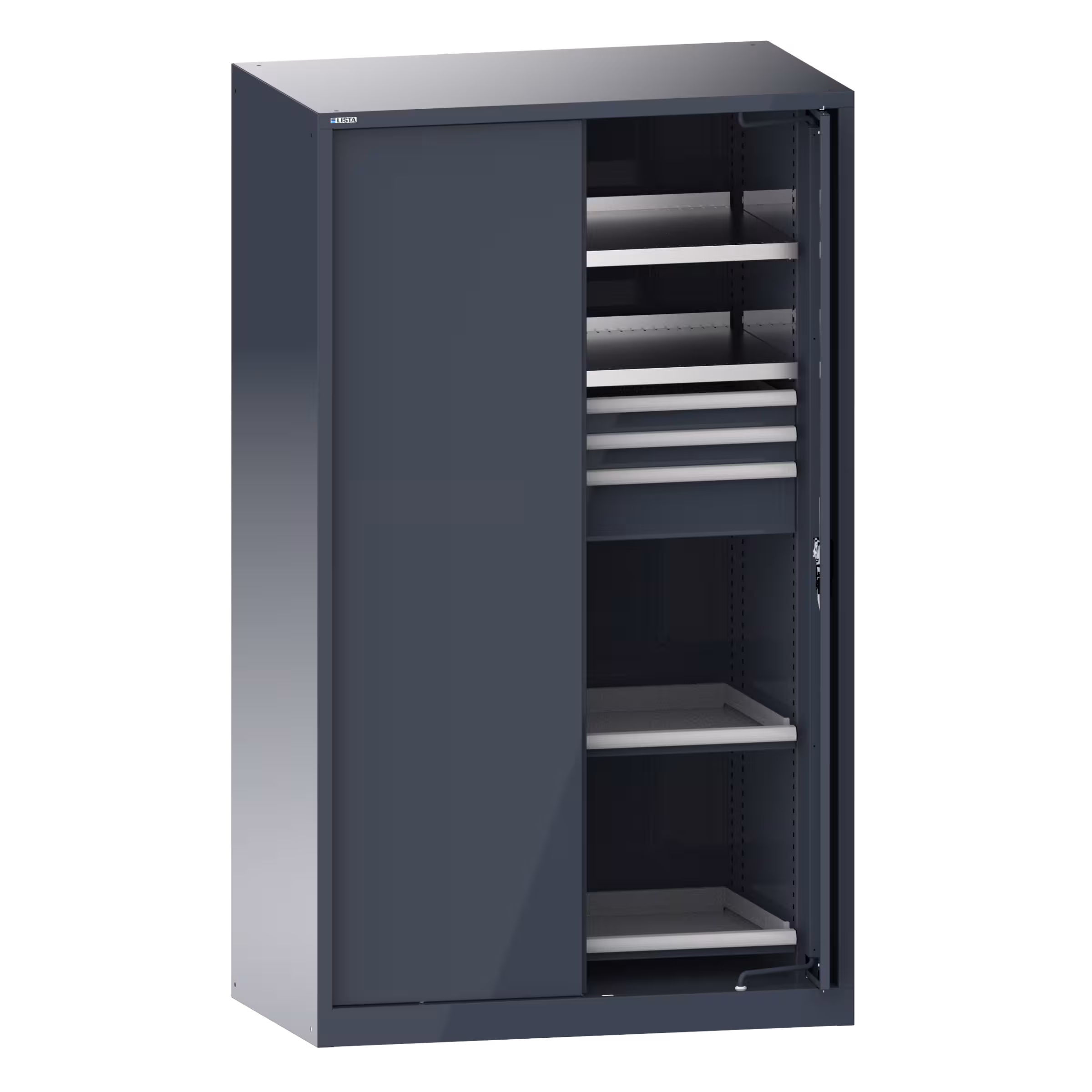 Armoire à charges lourdes avec 2 portes escamotables en tôle pleine 54x27E (LxPxH) 1146x690x1950mm 2 rayons, 3 tiroirs, 2 rayons extensibles KEY Lock Gris ardoise RAL 7015