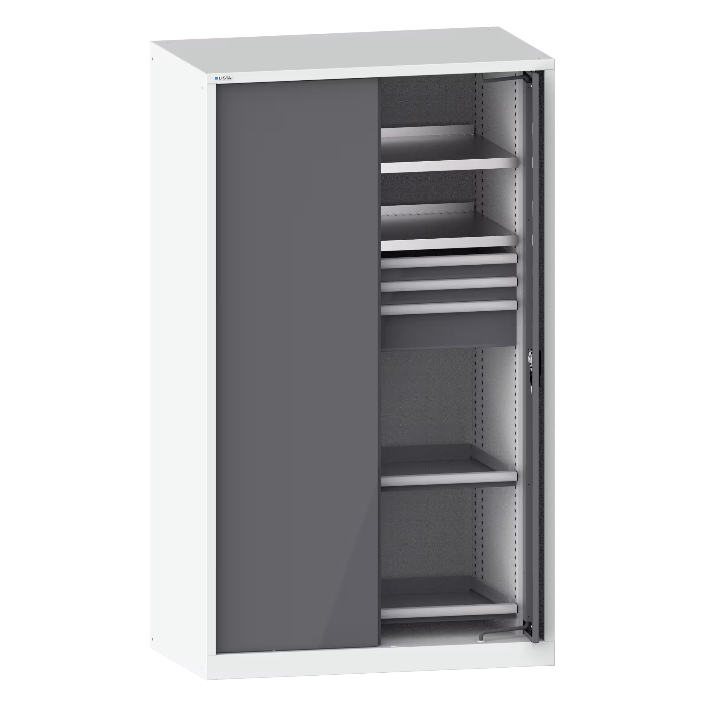 Armoire à charges lourdes avec 2 portes escamotables en tôle pleine 54x27E (LxPxH) 1146x690x1950mm 2 rayons, 3 tiroirs, 2 rayons extensibles KEY Lock Gris clair RAL 7035 / Gris métallique NCS S 6502-B
