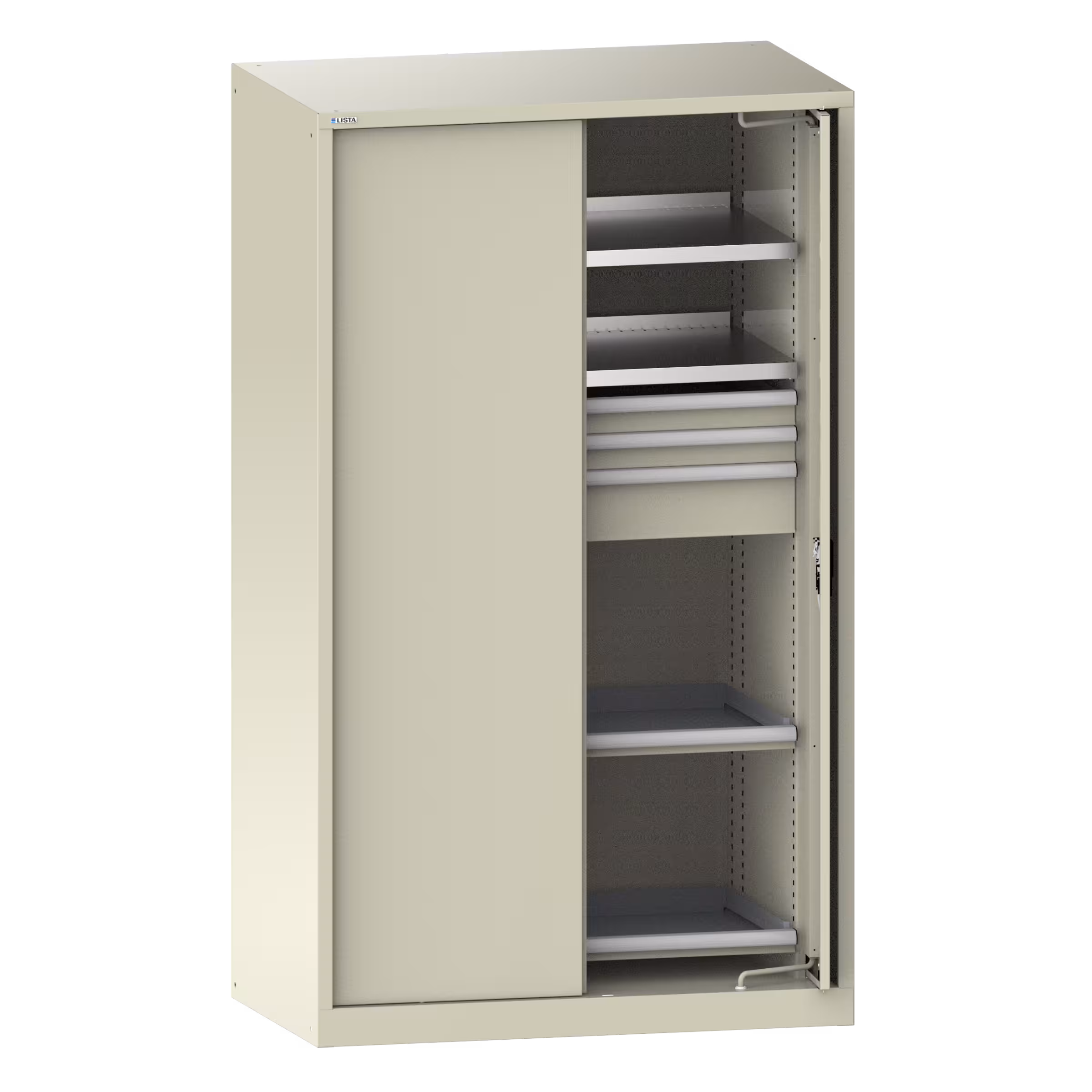 Armoire à charges lourdes avec 2 portes escamotables en tôle pleine 54x27E (LxPxH) 1146x690x1950mm 2 rayons, 3 tiroirs, 2 rayons extensibles KEY Lock Gris gravier RAL 7032