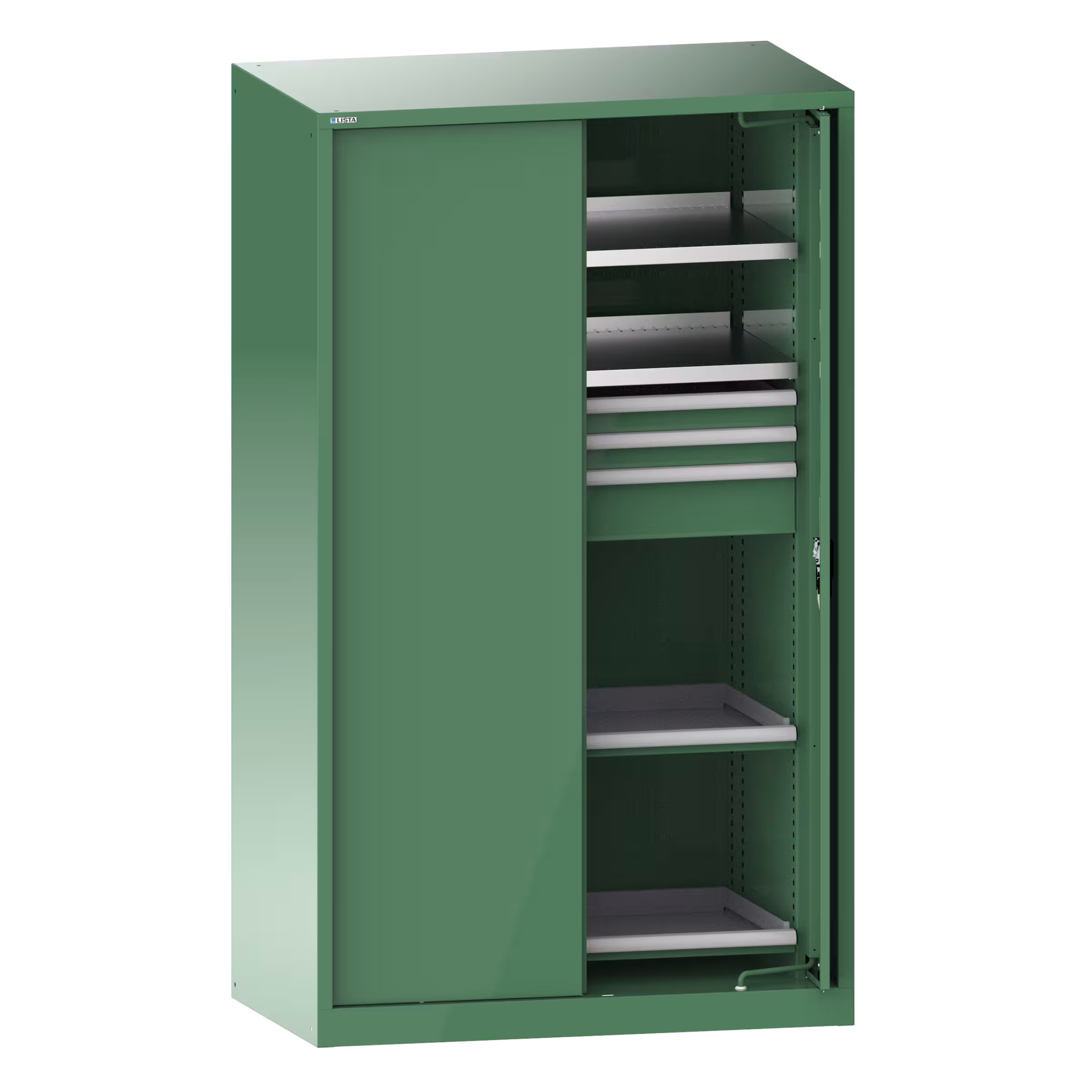 Armoire à charges lourdes avec 2 portes escamotables en tôle pleine 54x27E (LxPxH) 1146x690x1950mm 2 rayons, 3 tiroirs, 2 rayons extensibles KEY Lock Vert réséda RAL 6011