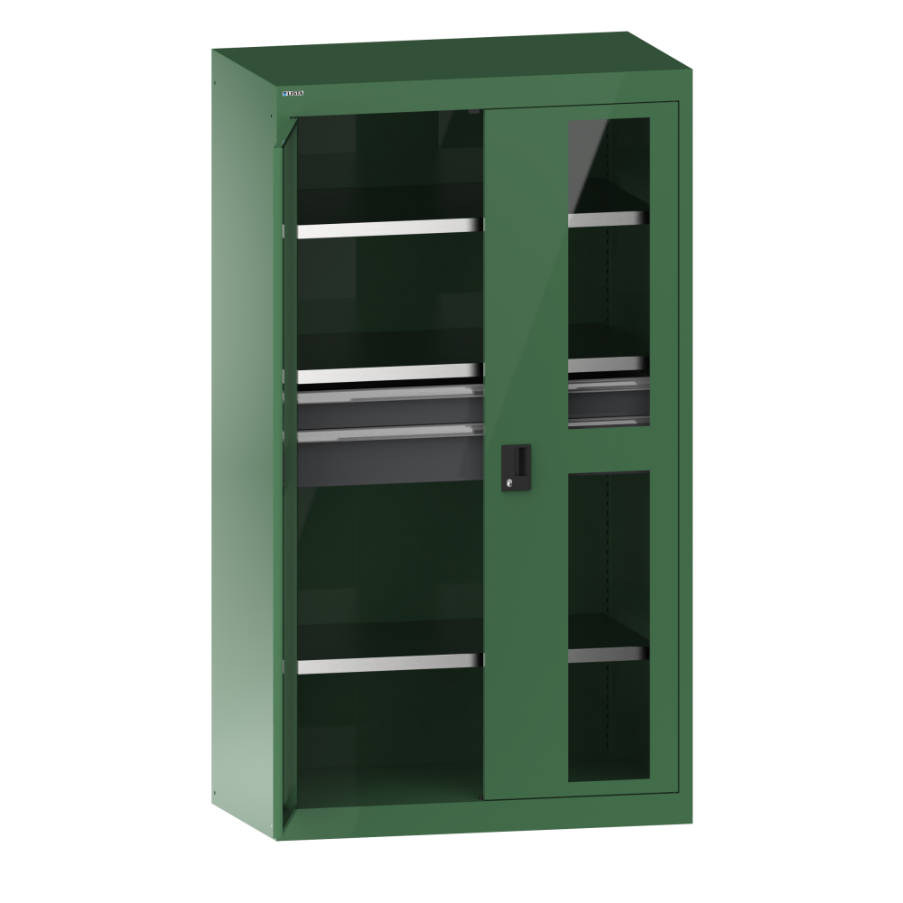 Armoire pour charges lourdes à portes battantes : Les armoires sont équipées de : rayons amovibles galvanisés, épaisseur 35 mm, rayons extensibles et tiroirs laqués gris NCS 4502-B. Portes battantes réalisées d'une pièce, en tôle pleine ou à fenêtres, au choix. Fermeture KEY Lock, CODE Lock ou RFID Lock possible.