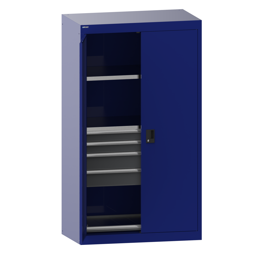 Armoire à charges lourdes avec portes battantes en tôle pleine 54x27E (LxPxH) 1100x641x1950mm 2 rayons, 4 tiroirs, 1 rayon extensible RFID Lock Bleu outremer RAL 5002
