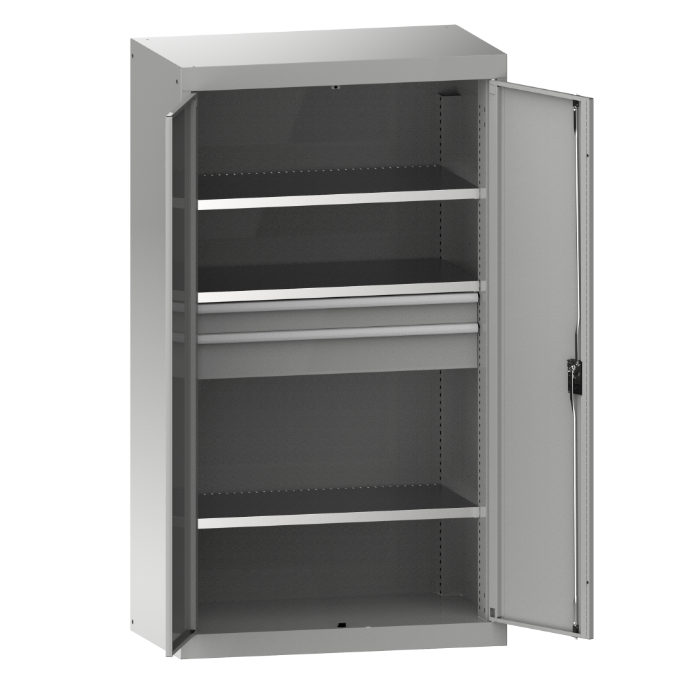 Armoire pour charges lourdes à portes battantes : Les armoires sont équipées de : rayons amovibles galvanisés, épaisseur 35 mm, rayons extensibles et tiroirs laqués gris NCS 4502-B. Portes battantes réalisées d'une pièce, en tôle pleine ou à fenêtres, au choix. Fermeture KEY Lock, CODE Lock ou RFID Lock possible.