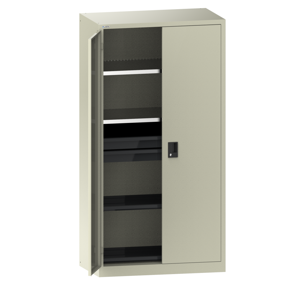 Armoires à portes battantes : Selon le modèle, les armoires sont équipées de : rayons amovibles galvanisés, épaisseur 30 mm, capacité de charge 60 kg. Rayons extensibles et tiroirs laqués, gris anthracite, RAL 7016, capacité de charge 50.