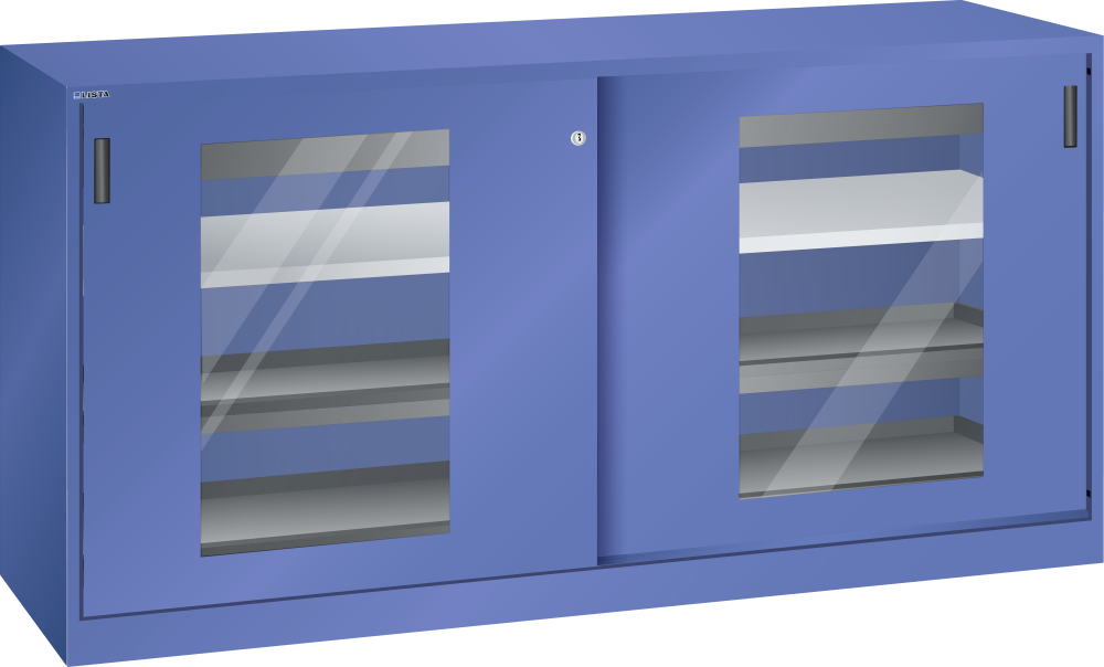 Armoire à portes coulissantes avec 2 portes à fenêtre transparente et paroi de séparation (LxPxH) 2000x580x1000mm 2 rayons, 2 tiroirs, 4 rayons extensibles KEY Lock Bleu sécurité RAL 5005