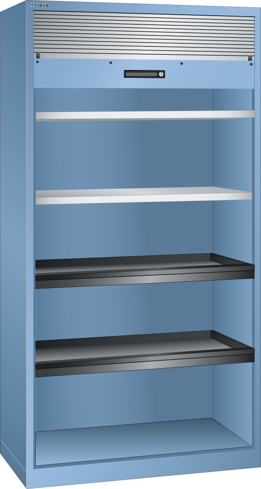Armoires à rideaux : Selon le modèle, les armoires sont équipées de : rayons amovibles galvanisés, épaisseur 30 mm, capacité de charge 60 kg. Rayons extensibles et tiroirs laqués, gris anthracite, RAL 7016, capacité de charge 50. Rideau en PVC, couleur similaire à gris clair, RAL 7035