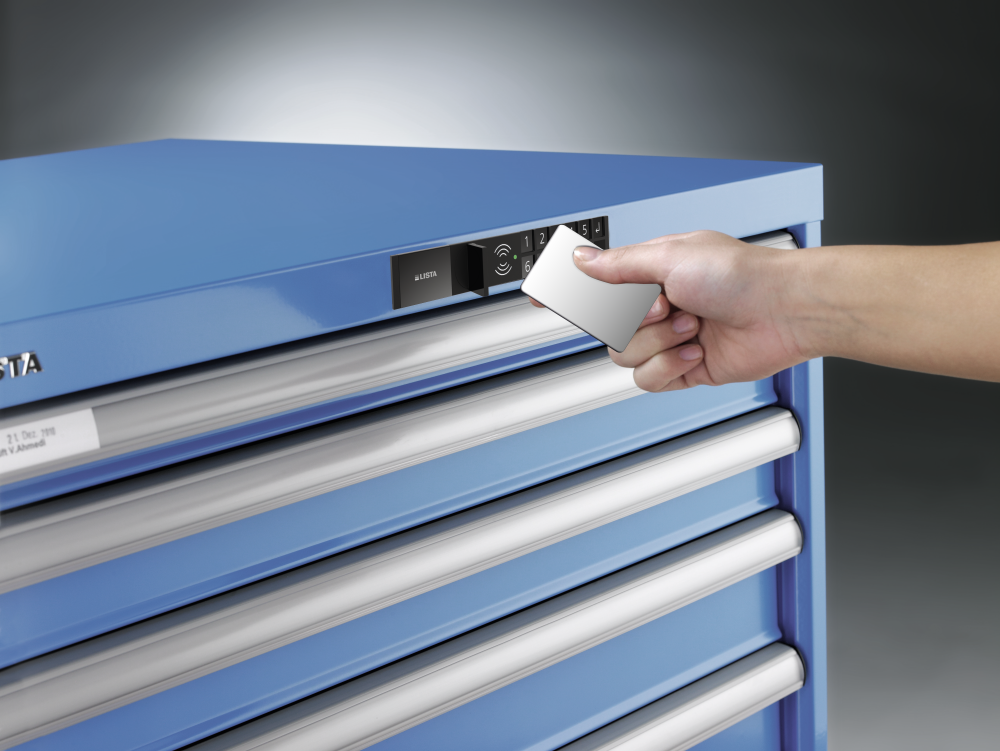RFID Lock : En plus du CODE Lock, le LISTA RFID Lock permet une fermeture et ouverture à l'aide de l'identification par radiofréquence RFID habituelle. Il se compose d'un transpondeur placé dans la serrure et de badges / cartes / étiquettes RFID mobiles usuels. Ouverture/fermeture manuelle au moyen d'un badge RFID ou d'un numéro de code.