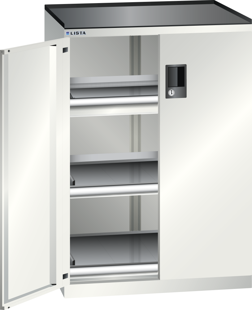 Armoire à tiroirs avec portes battantes 36x27E (LxPxH) 717x600x1020mm 1 tiroir (75kg), 2 rayons extensibles (75kg) RFID Lock Blanc gris RAL 9002