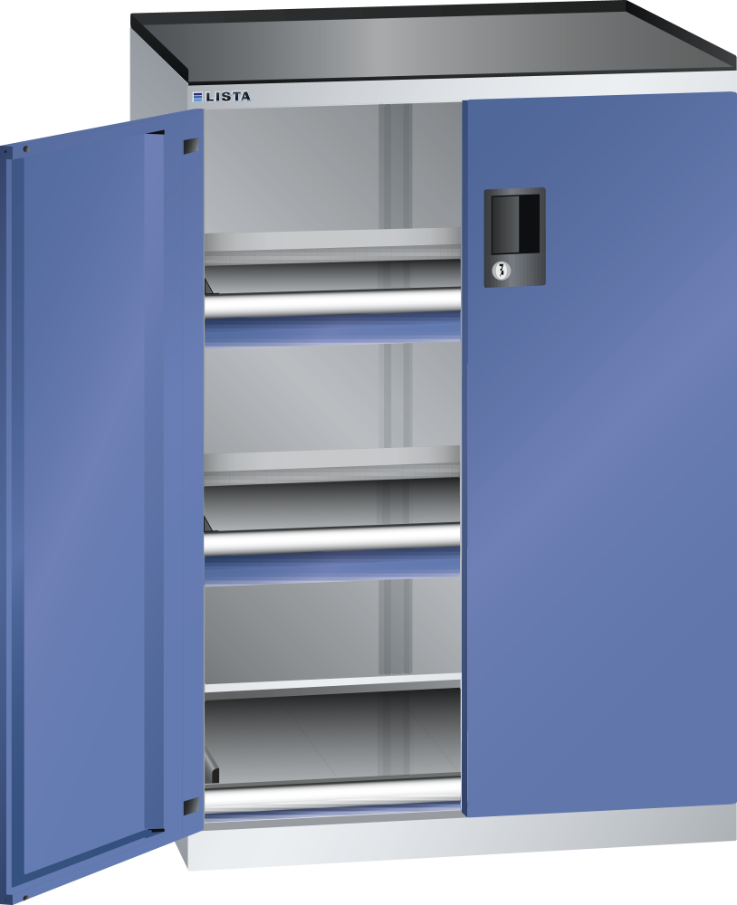 Armoire à tiroirs avec portes battantes 36x27E (LxPxH) 717x600x1020mm 2 tiroirs (75kg), 1 rayon extensible (75kg) KEY Lock Gris clair RAL 7035 / Bleu sécurité RAL 5005