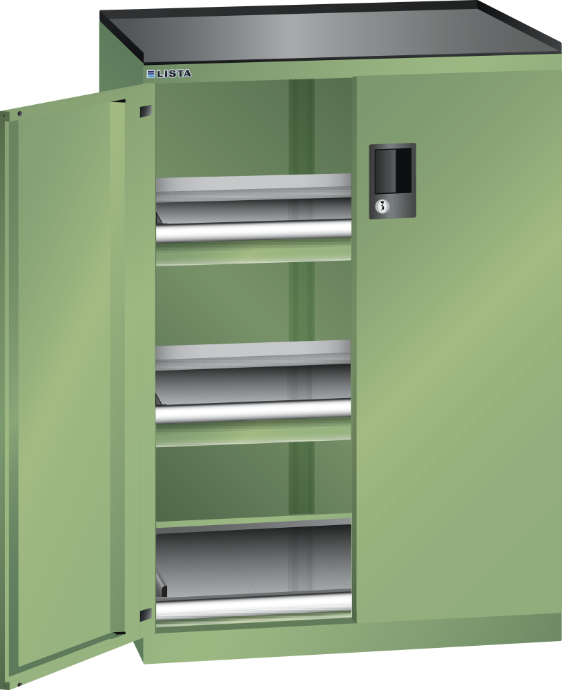Armoire à tiroirs avec portes battantes 36x27E (LxPxH) 717x600x1020mm 2 tiroirs (75kg), 1 rayon extensible (75kg) KEY Lock Vert réséda RAL 6011