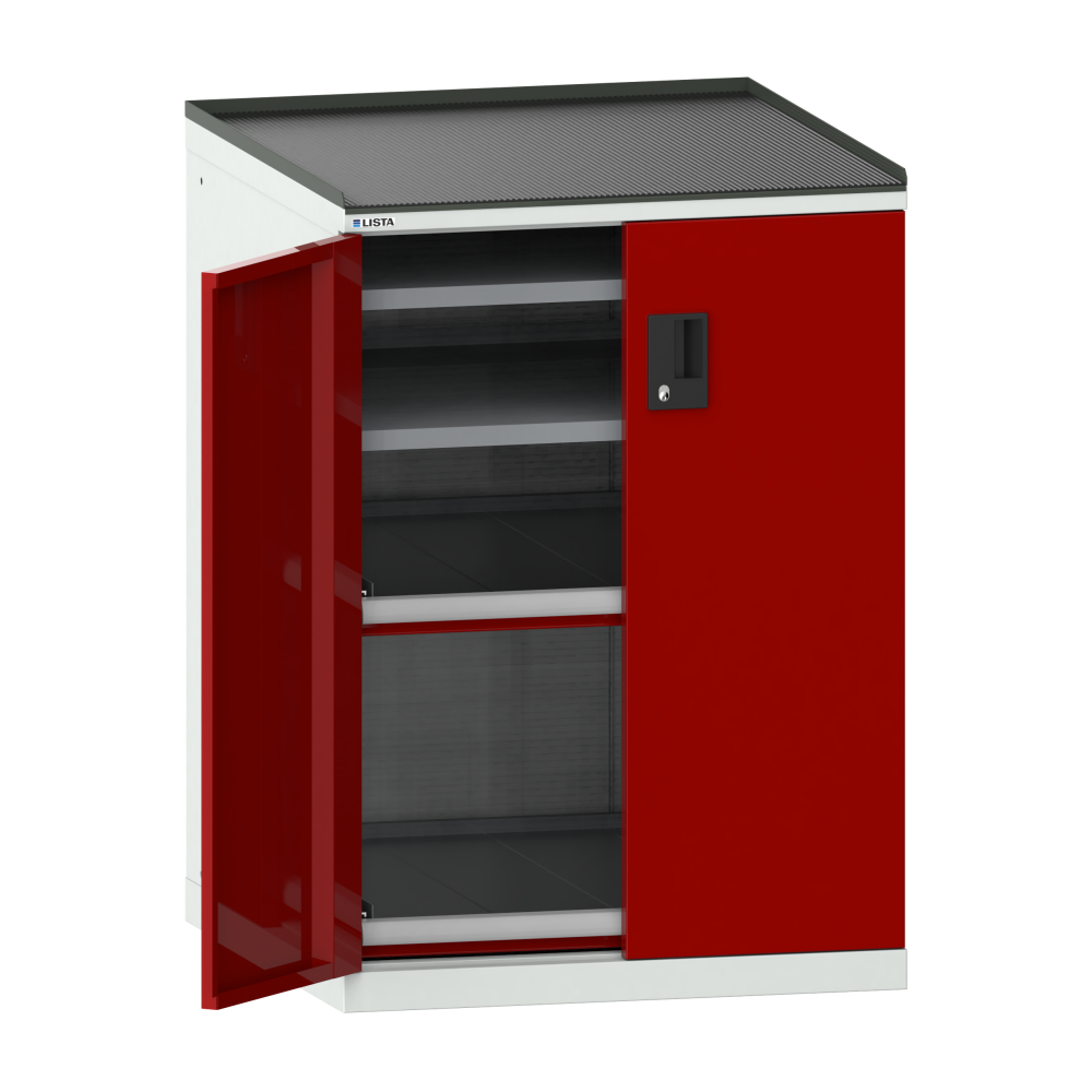 Armoire à tiroirs avec portes battantes 36x36E (LxPxH) 717x753x1020mm 2 rayons extensibles (75kg), 2 rayons amovibles (200kg) RFID Lock Gris clair RAL 7035 / Rouge rubis RAL 3003
