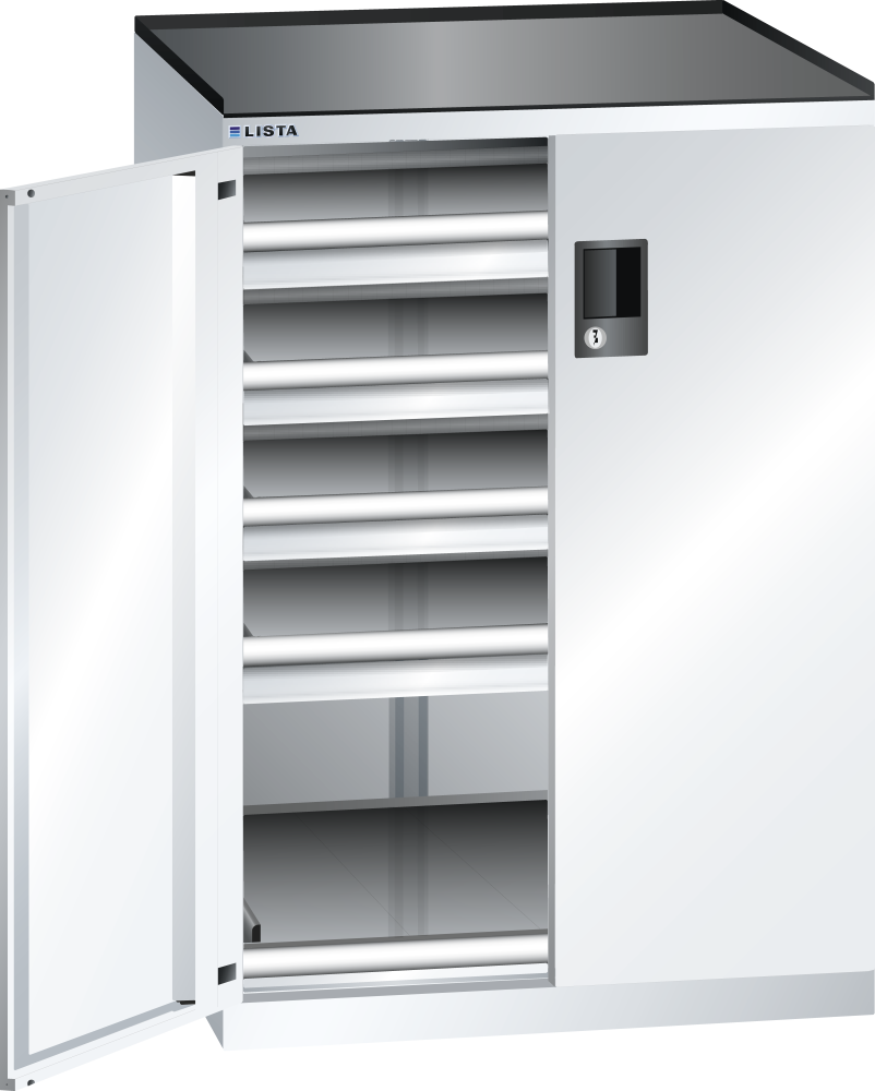 Armoire à tiroirs avec portes battantes 36x36E (LxPxH) 717x753x1020mm 4 tiroirs (200kg), 1 rayon extensible (200kg) RFID Lock Blanc pur RAL 9010