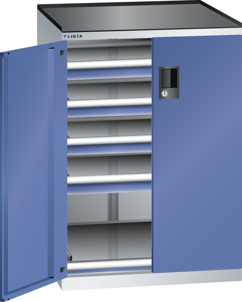 Armoire à tiroirs avec portes battantes 36x36E (LxPxH) 717x753x1020mm 4 tiroirs (200kg), 1 rayon extensible (200kg) RFID Lock Gris clair RAL 7035 / Bleu sécurité RAL 5005