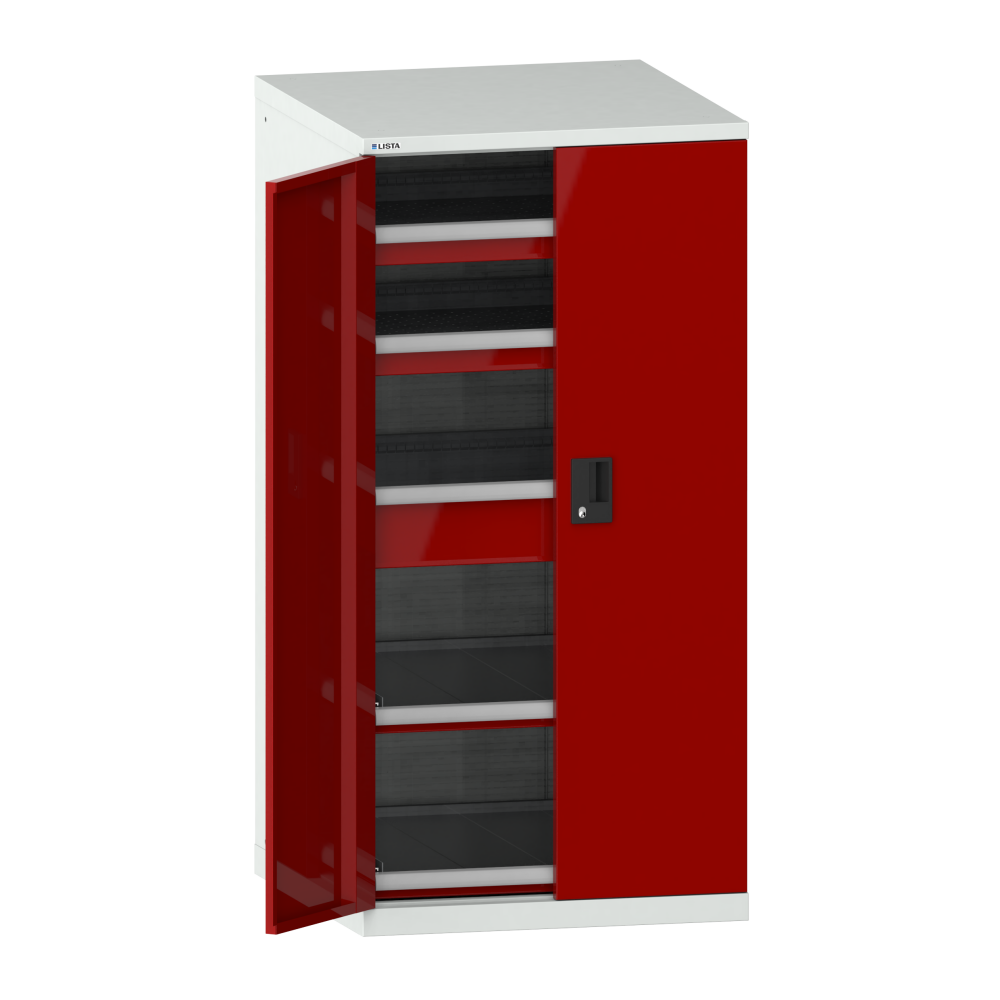 Armoire à tiroirs avec portes battantes 36x36E (LxPxH) 717x753x1450mm 3 tiroirs (75kg), 2 rayons extensibles (75kg) KEY Lock Gris clair RAL 7035 / Rouge rubis RAL 3003