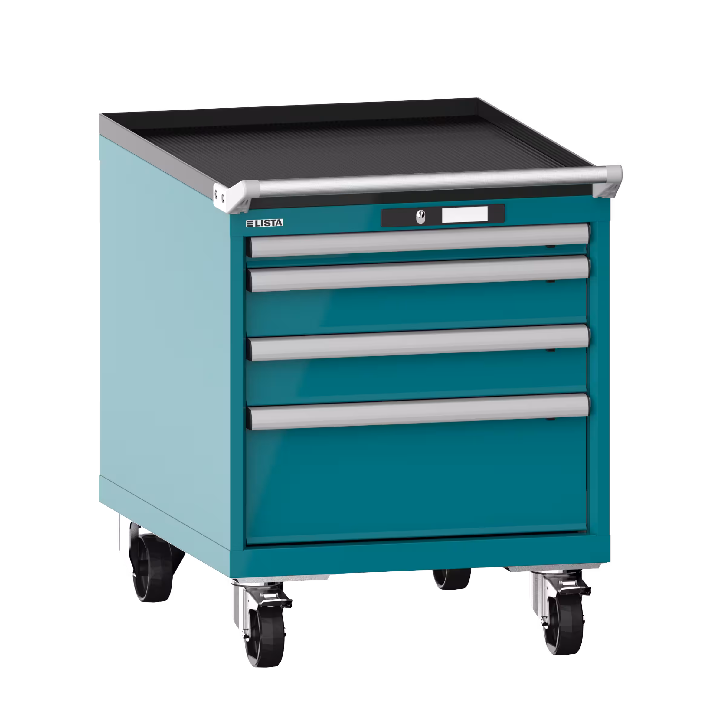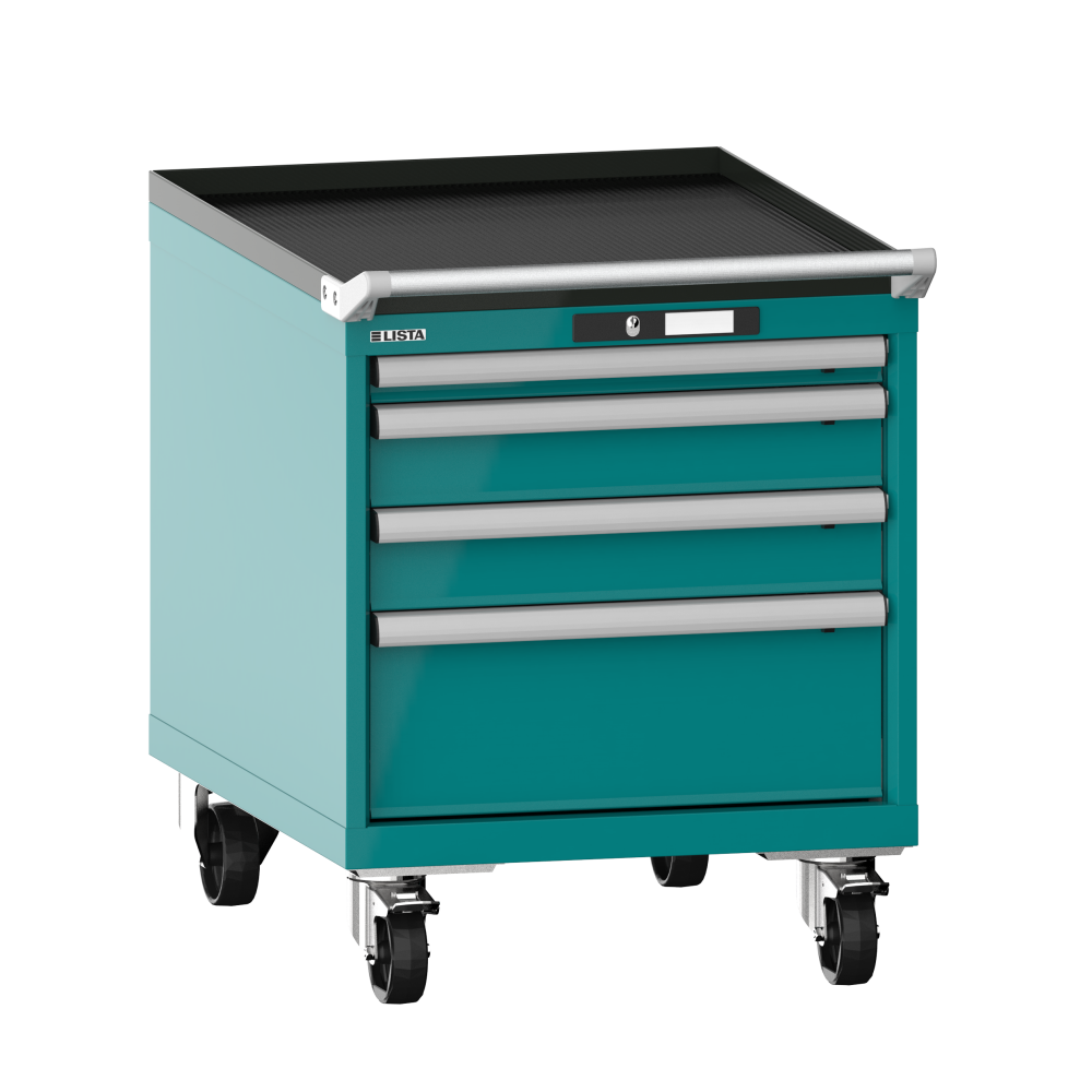 Armoire à tiroirs mobile 27x36E (LxPxH) 564x725x723mm 4 tiroirs (1x50/2x100/1x200) 75kg roues en nylon Ø100mm KEY Lock Bleu turquoise RAL 5018