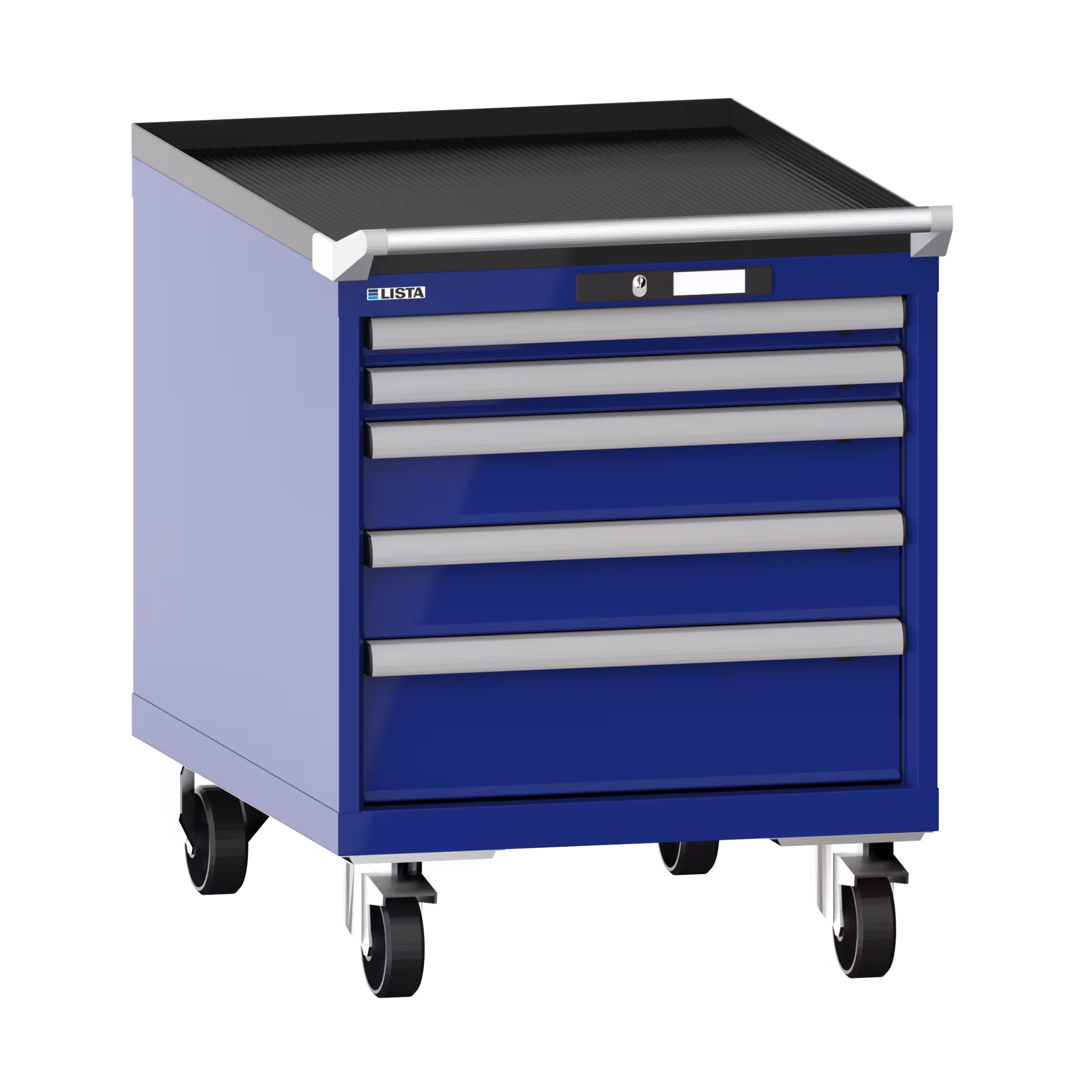 Armoire à tiroirs mobile 27x36E (LxPxH) 564x725x723mm 5 tiroirs (2x50/2x100/1x150) 75kg roues en nylon Ø100mm KEY Lock Bleu outremer RAL 5002