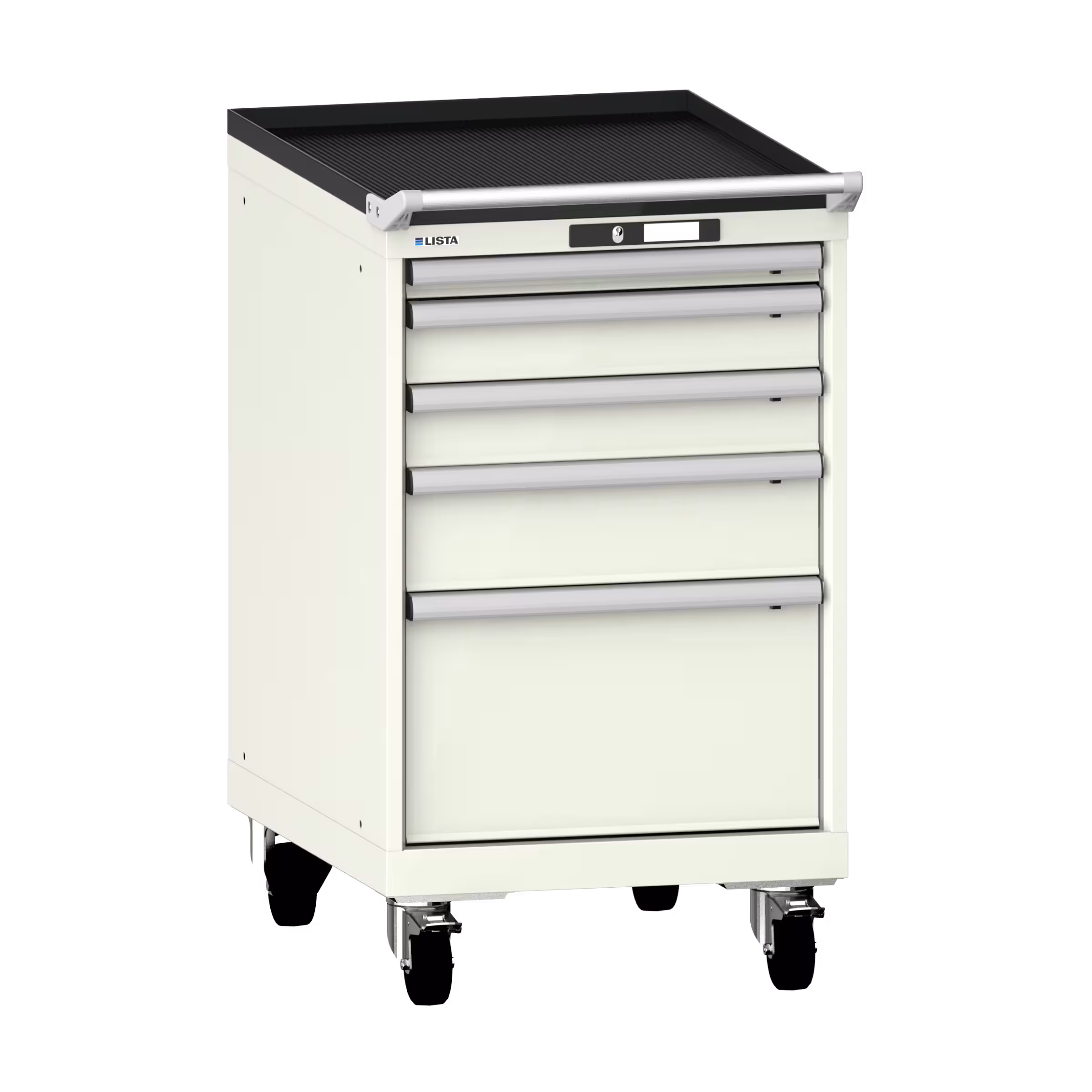 Armoire à tiroirs mobile 27x36E (LxPxH) 564x725x990mm 5 tiroirs (1x50/2x100/1x150/1x300) 75kg roues en nylon Ø100mm KEY Lock Blanc gris RAL 9002