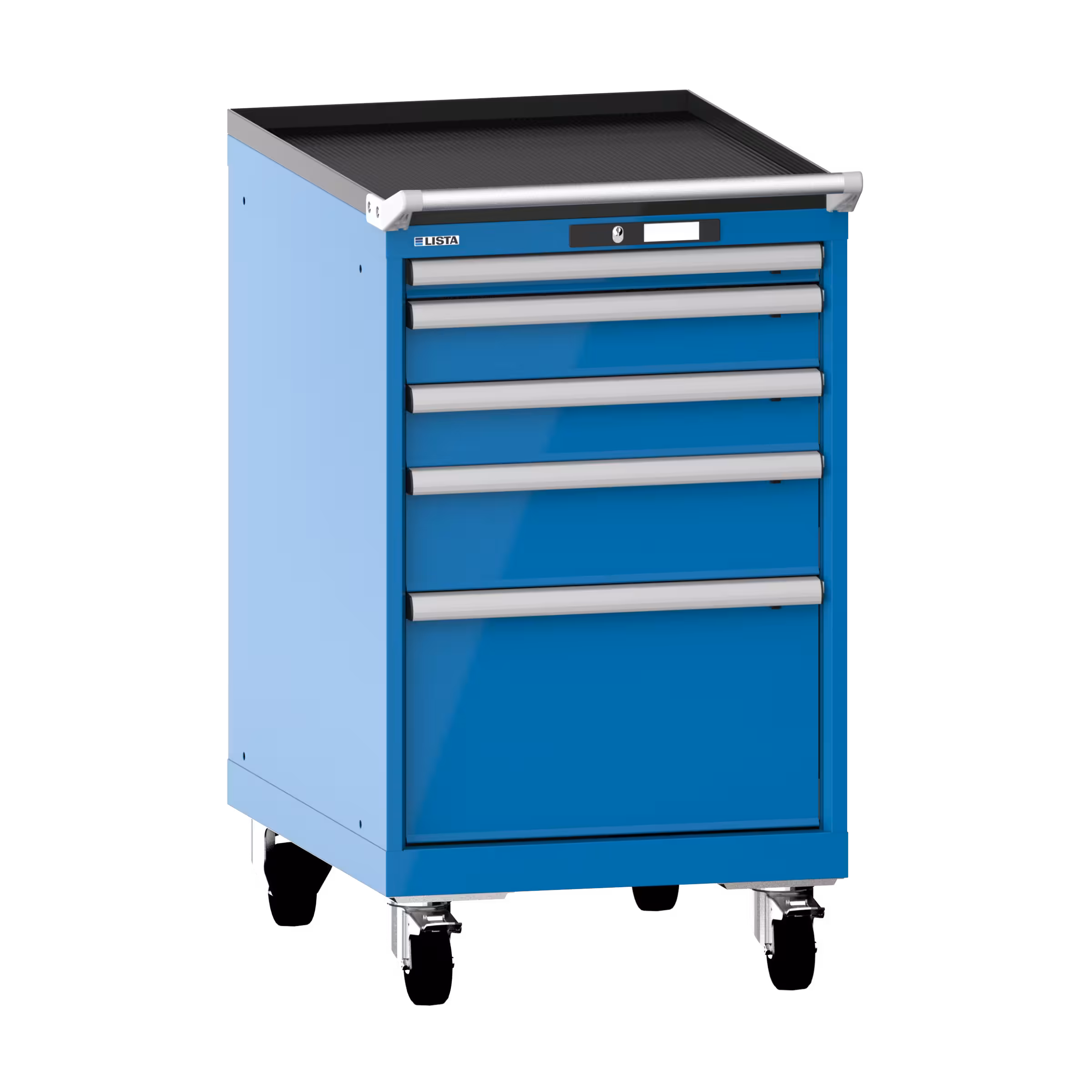 Sécurité pour tiroirs, sécurité de blocage individuelle des tiroirs à droite : Considérée comme exigence minimum pour les armoires à tiroirs mobiles. La sécurité de blocage à droite est désactivée d'une main et empêche l’ouverture involontaire de tiroirs même quand l’armoire n’est pas fermée.