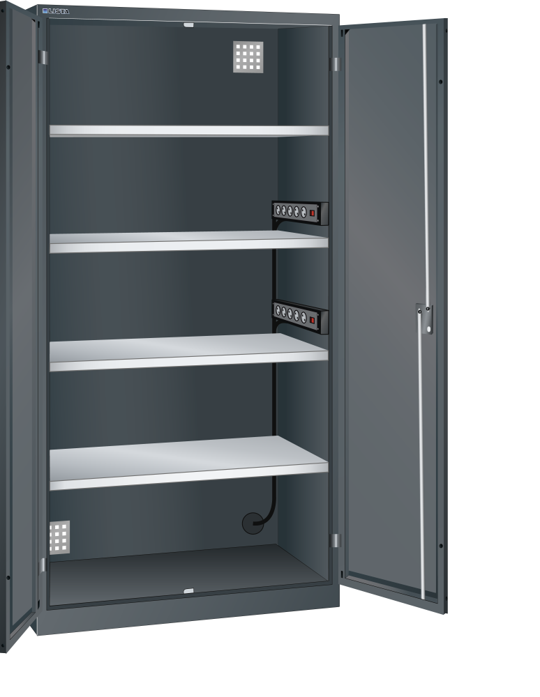 Armoires avec prises électriques à portes battantes : Selon le modèle, les armoires sont équipées de : rayons amovibles galvanisés, épaisseur 30 mm, capacité de charge 60 kg. Tiroirs laqués gris anthracite (RAL 7016), capacité de charge 50 kg. Blocs multiprises avec interrupteur marche/arrêt et 4 ou 5 boîtes à prises de courant 230 V.