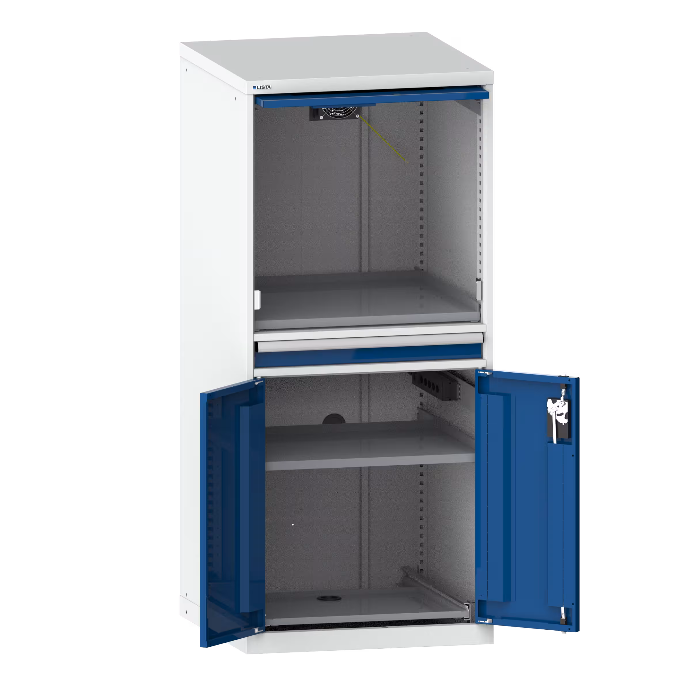 1 armoire pour hardware avec portes battantes, comprenant fermeture, alimentation électrique intégrée et comprenant un listeau de 4 prises (230 V) avec interrupteur éclairé, extension d’appareil, rayon amovible lisse,