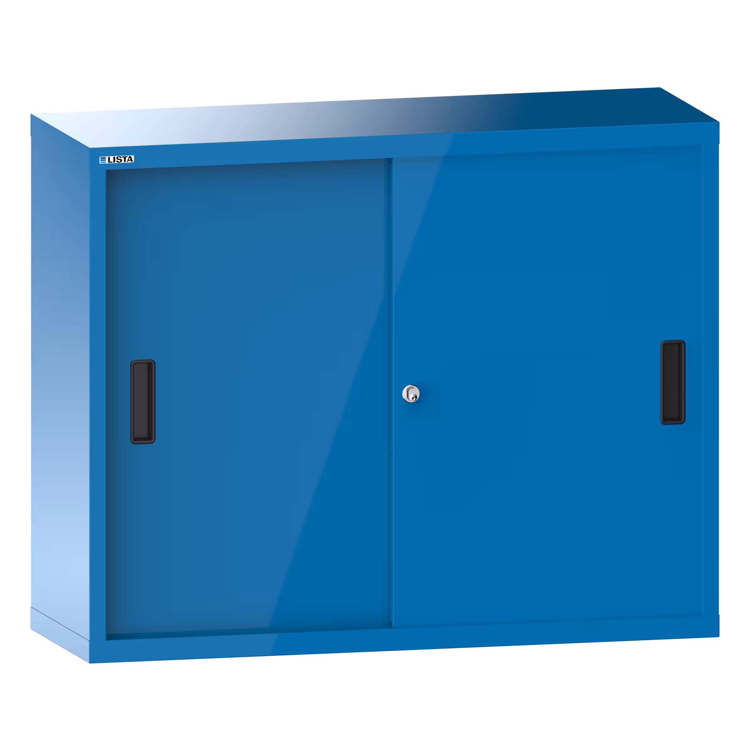 Armoire suspendue avec portes coulissantes en tôle pleine (LxPxH) 1000x350x800mm avec matériel de fixation pour paroi arrière perforé sur montant porteur, KEY Lock Bleu clair RAL 5012
