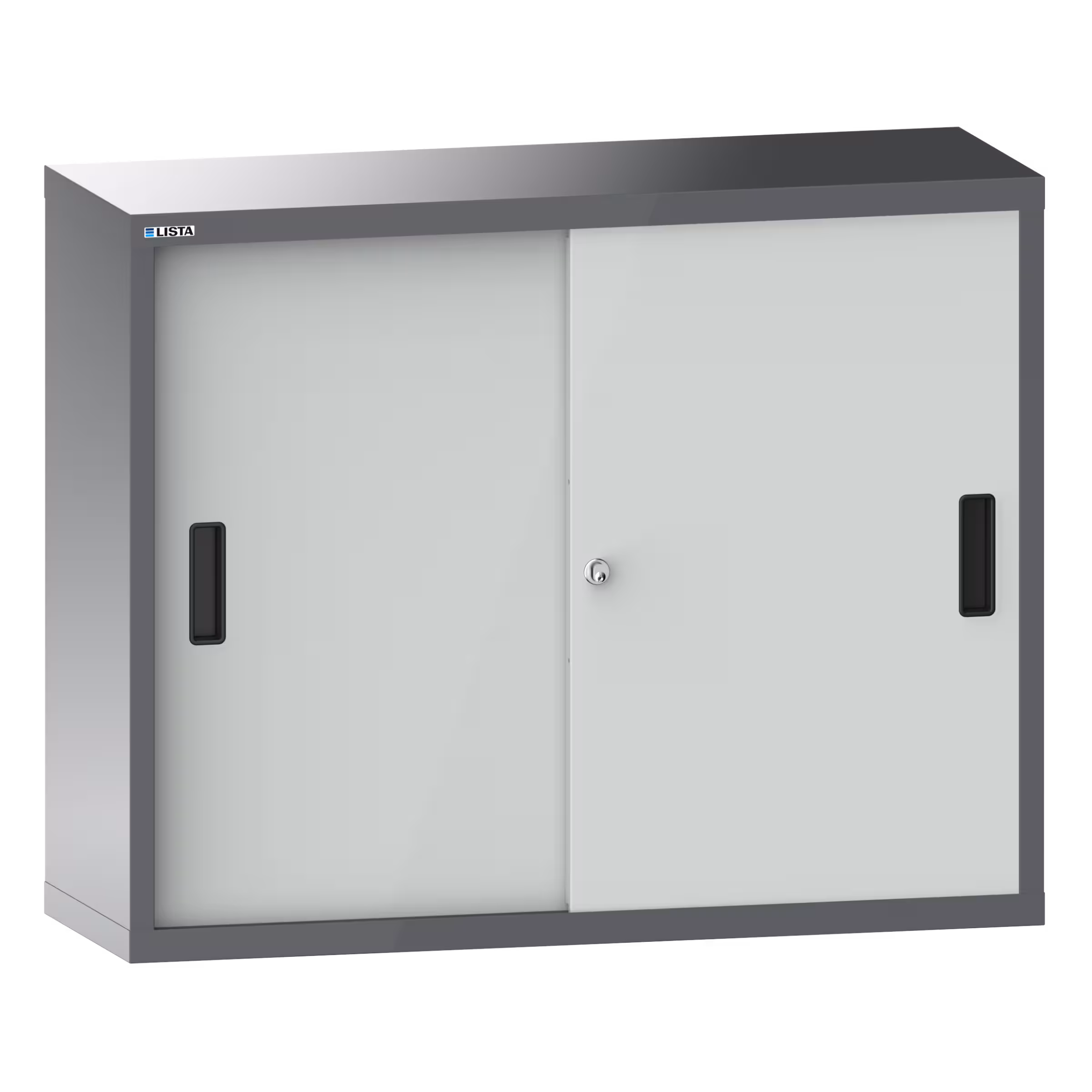 Armoire suspendue avec portes coulissantes en tôle pleine (LxPxH) 1000x350x800mm avec matériel de fixation pour paroi arrière perforé sur montant porteur, KEY Lock Gris métallique NCS S 6502-B / Gris clair RAL 7035