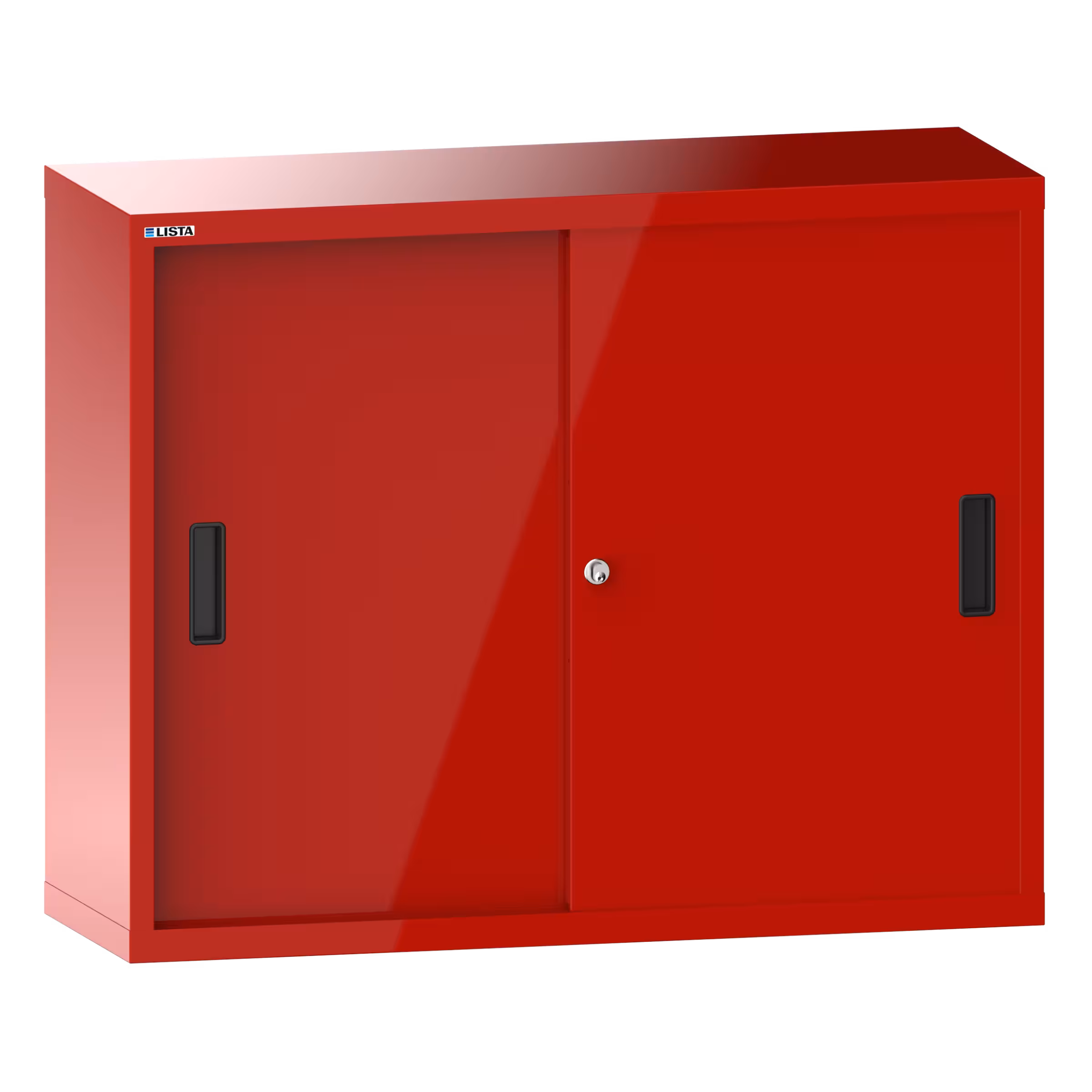 Armoire suspendue avec portes coulissantes en tôle pleine (LxPxH) 1000x350x800mm avec matériel de fixation pour paroi arrière perforé sur montant porteur, KEY Lock Rouge feu RAL 3000