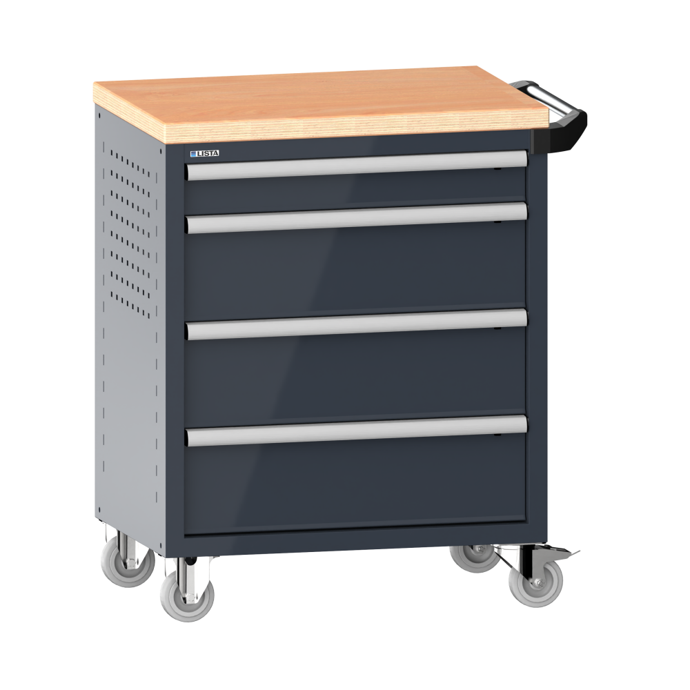 Chariot d'atelier 36x27E (LxPxH) 833x525x945mm 4 tiroirs (1x100/3x200) 40kg avec revêtement en bois multiplex sécurité de blocage individuelle à droite KEY Lock Gris ardoise RAL 7015