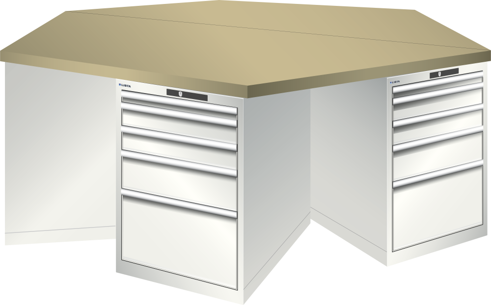 Établi hexagonaux 27x36E (LxPxH) 2500x2165x840mm 6 x 5 tiroirs (1x50/2x100/1x150/1x300) 75kg Multiplex AUTO Lock Blanc gris RAL 9002