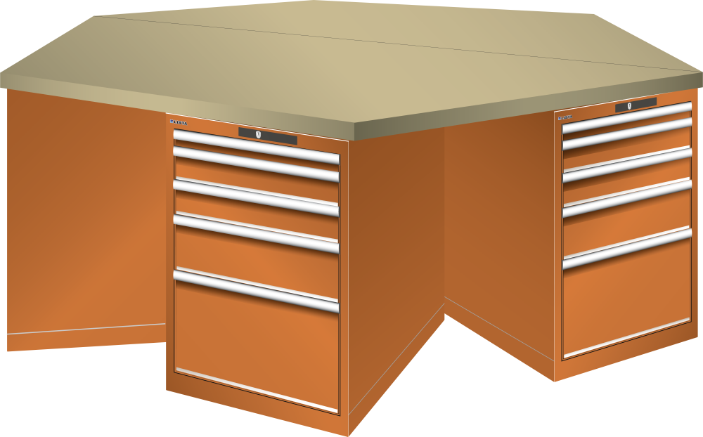 Établi hexagonaux 27x36E (LxPxH) 2500x2165x840mm 6 x 5 tiroirs (1x50/2x100/1x150/1x300) 75kg Multiplex AUTO Lock Orange RAL 2004
