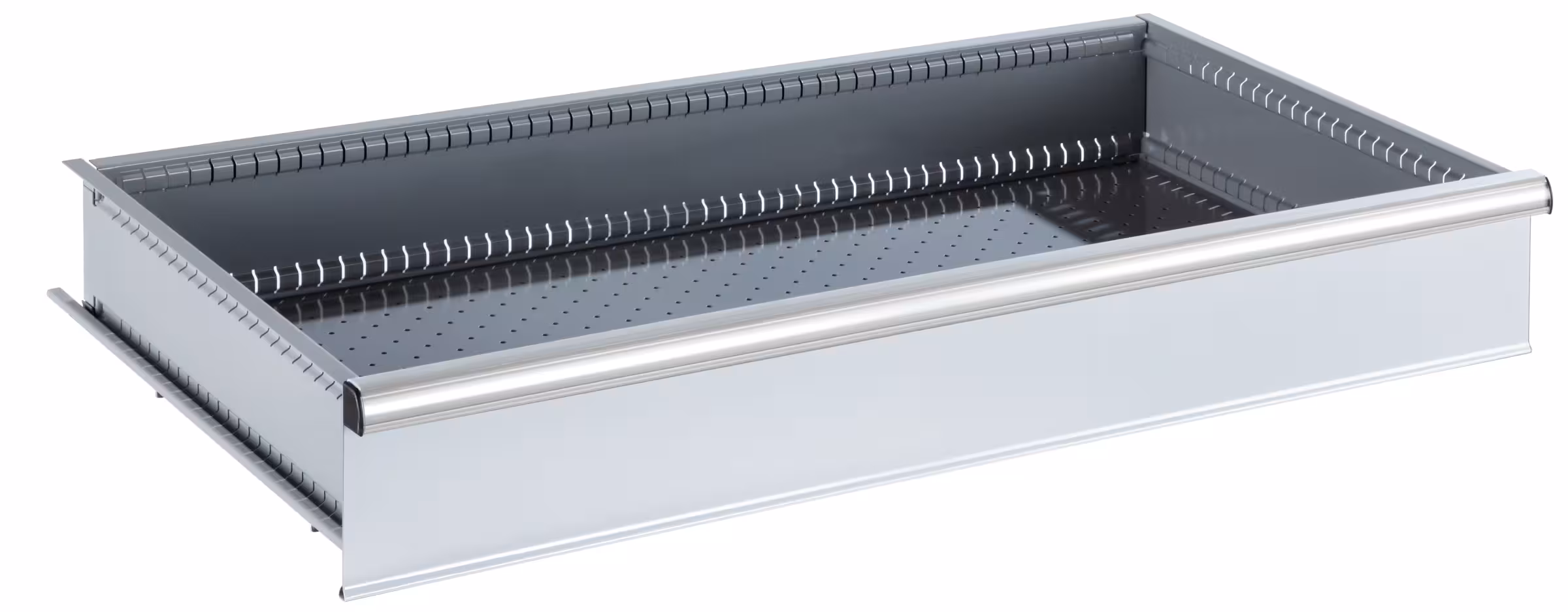 Tiroirs : Les tiroirs des hauteurs frontales les plus diverses peuvent être montés dans le même bâti d'armoire dans n'importe quel ordre. Les parois des tiroirs sont dotées à l'intérieur des 4 côtés d'une trame des fentes par unités (E) de 17 mm, ce qui permet une subdivision personnalisée. Couleur : gris NCS 4502-B.
