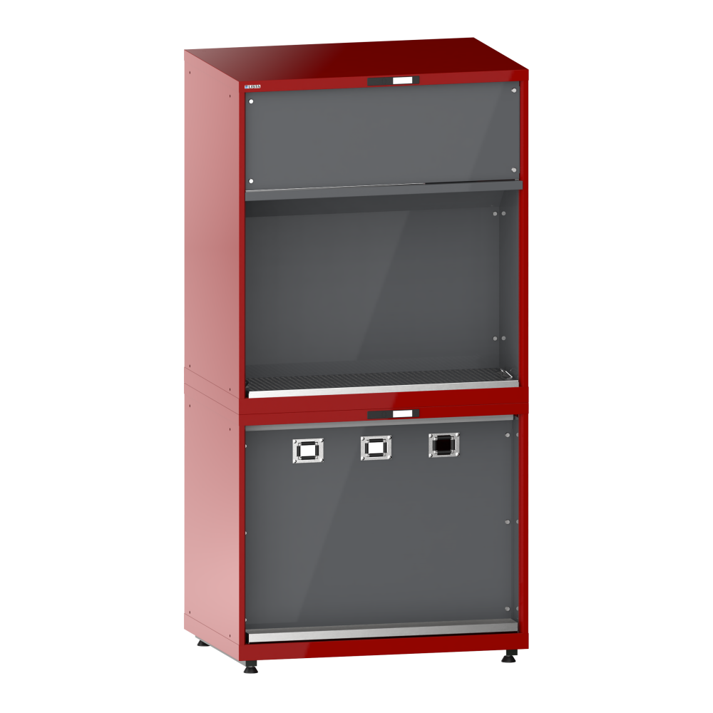 La structure intérieure intelligente permet d’accueillir des grands enrouleurs de flexibles ainsi que de pistolets à commande manuelle allongés. Les pupitres peuvent être équipés d’une unité de commande individuelle dans l’armoire superposée.