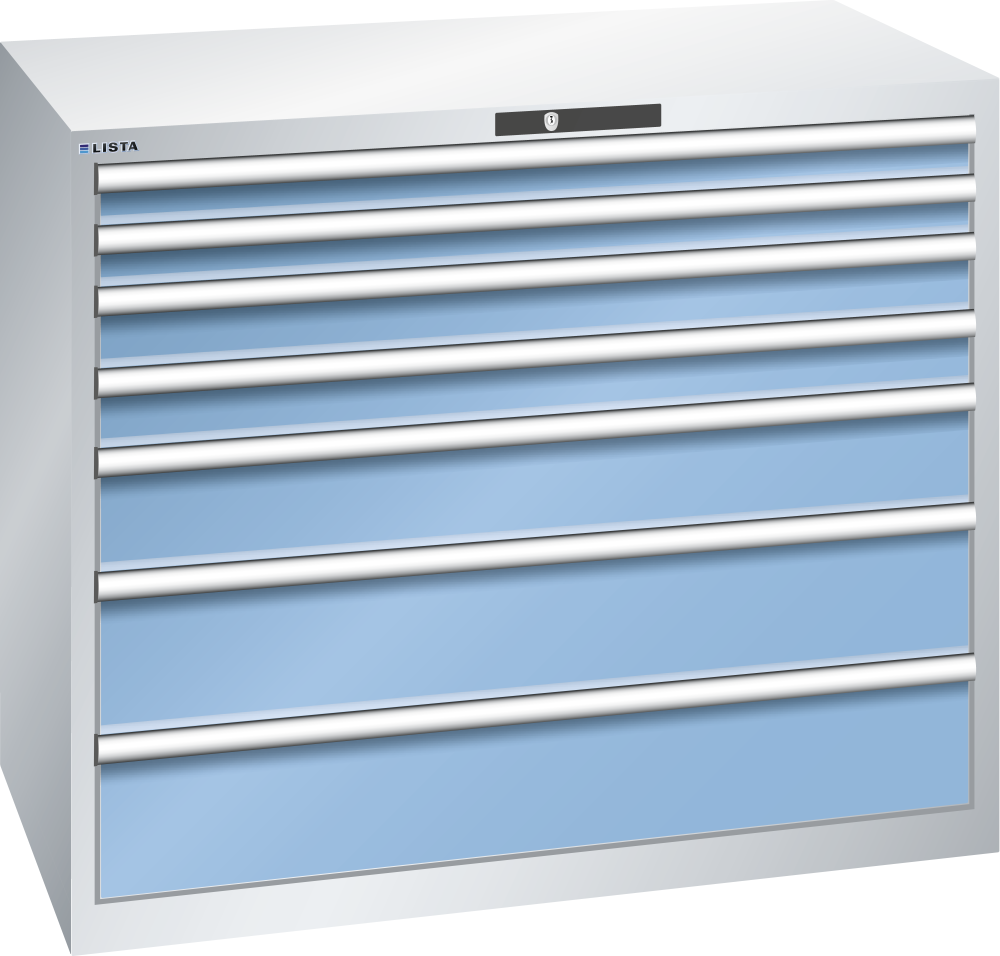 Armadio a cassetti 64x36E (LxPxA) 1193x725x1000mm 7 cassetti (2x75/2x100/1x150**/2x200**) 75/**200kg CODE Lock Grigio luce RAL 7035 / Blu luce RAL 5012