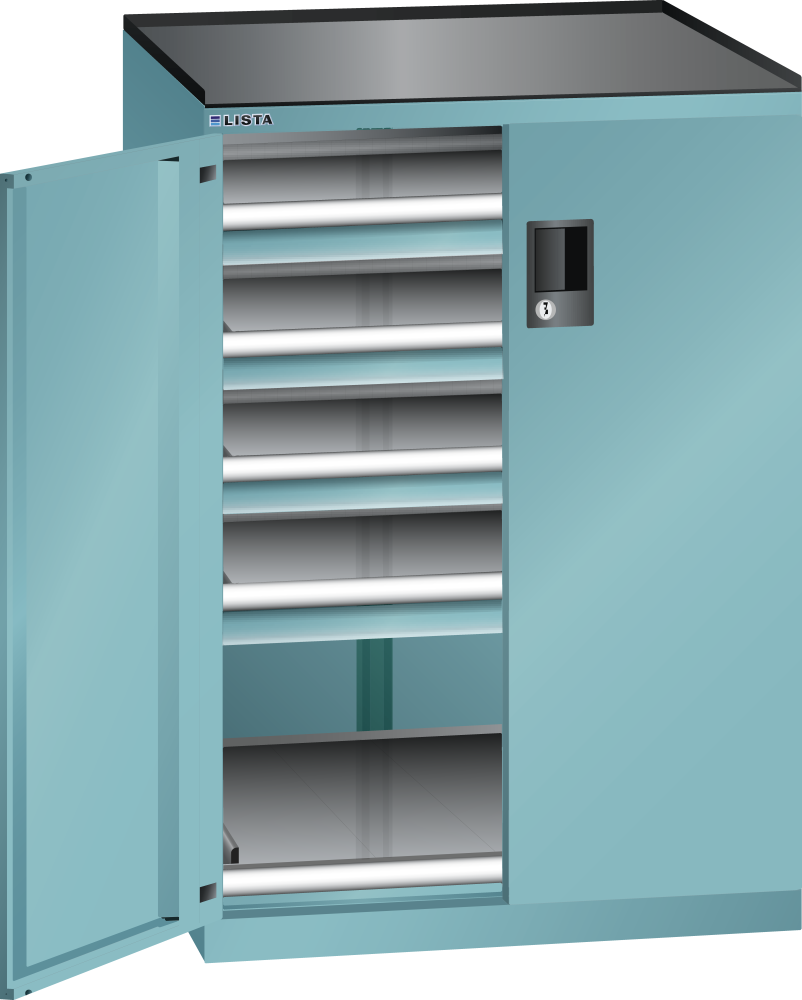 Armadio a cassetti con ante a battente 36x36E (LxPxA) 717x753x1020mm 4 cassetti (200kg), 1 ripiani estraibili (200kg) RFID Lock Blu turchese RAL 5018
