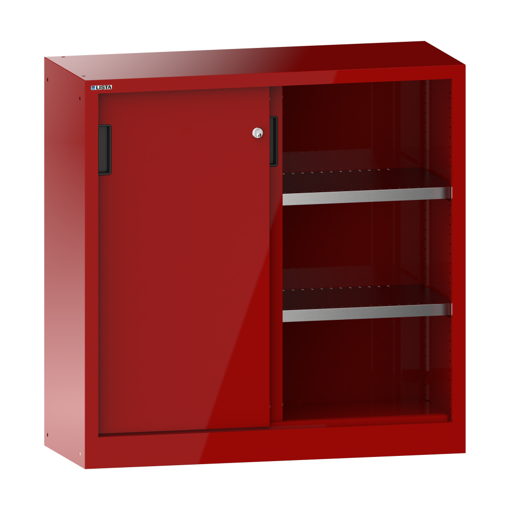 Armadi con porte scorrevoli: tutti gli armadi possiedono, in base al modello, la dotazione seguente: ripiano spostabile zincato, spessore 30 mm, portata 60 kg, ripiano estraibile e cassetti verniciati, grigio antracite, RAL 7016, portata 50 kg.