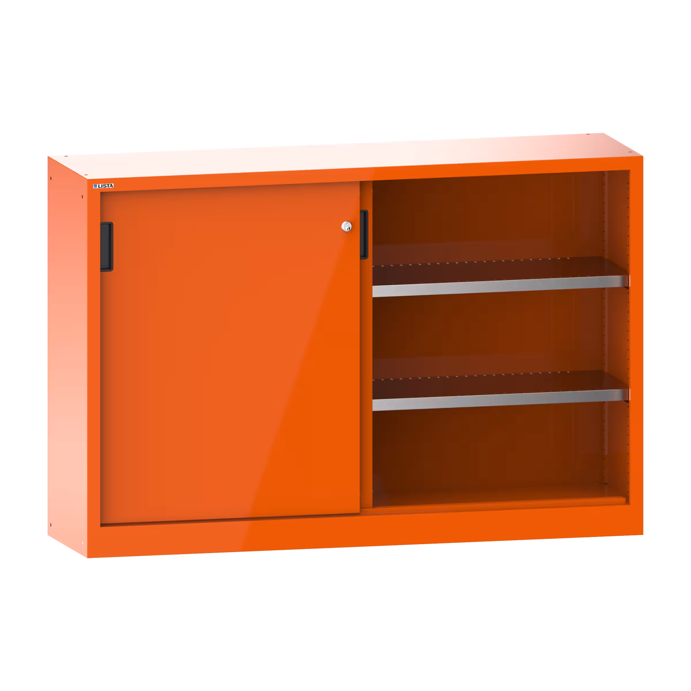 Armadio con ante scorrevoli con 2 ante in lamiera piena e parete divisoria (LxPxA) 1500x400x1000mm 4 ripiani spostabili KEY Lock Arancione RAL 2004