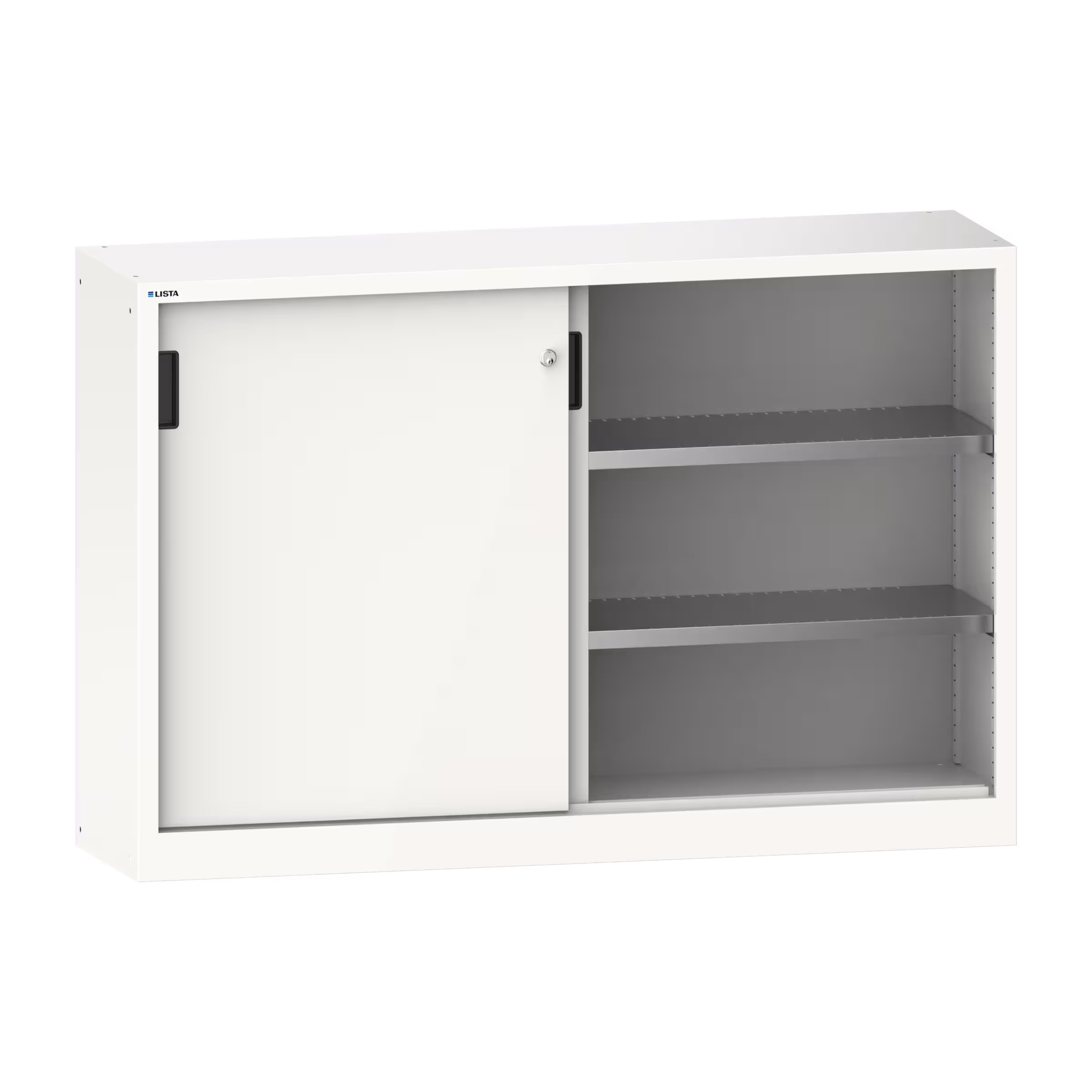 Armadio con ante scorrevoli con 2 ante in lamiera piena e parete divisoria (LxPxA) 1500x400x1000mm 4 ripiani spostabili KEY Lock Bianco puro RAL 9010