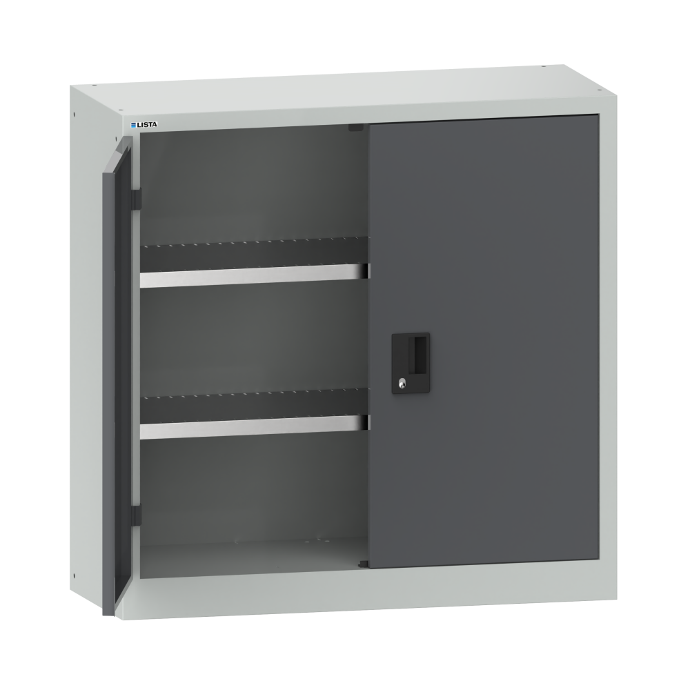 Armadi con porte battenti: tutti gli armadi possiedono, in base al modello, la dotazione seguente: ripiano spostabile zincato, spessore 30 mm, portata 60 kg, ripiano estraibile e cassetti verniciati, grigio antracite, RAL 7016, portata 50 kg.