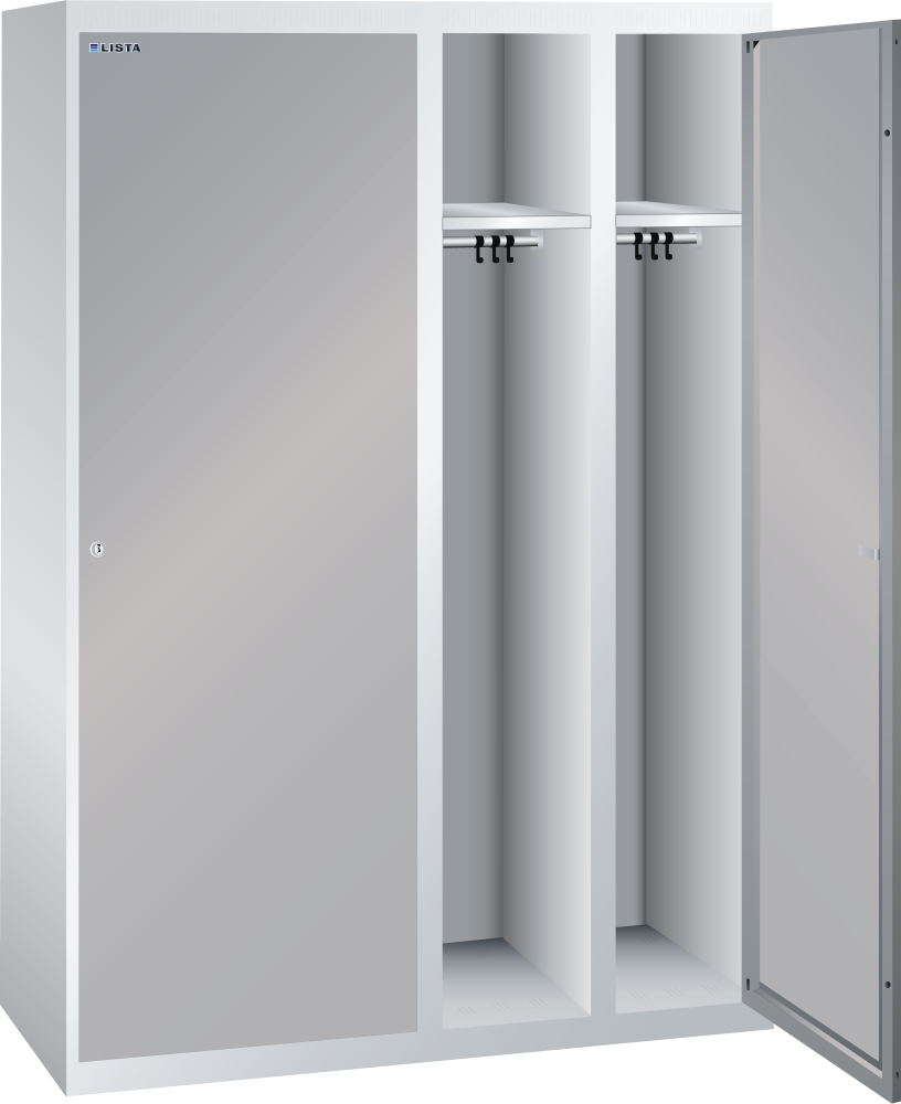 Armadi guardaroba: gli armadi guardaroba possiedono, in base allo scomparto e al modello, la dotazione seguente: 1 porta a battente in lamiera piena integrata, superficie liscia oppure con fori per ulteriore aerazione (2 scomparto richiudibile / 1 serratura per 2 scomparti), 1 appendiabiti con 3 ganci appendiabiti scorrevoli ciascuno, 1 porta asciugamani.